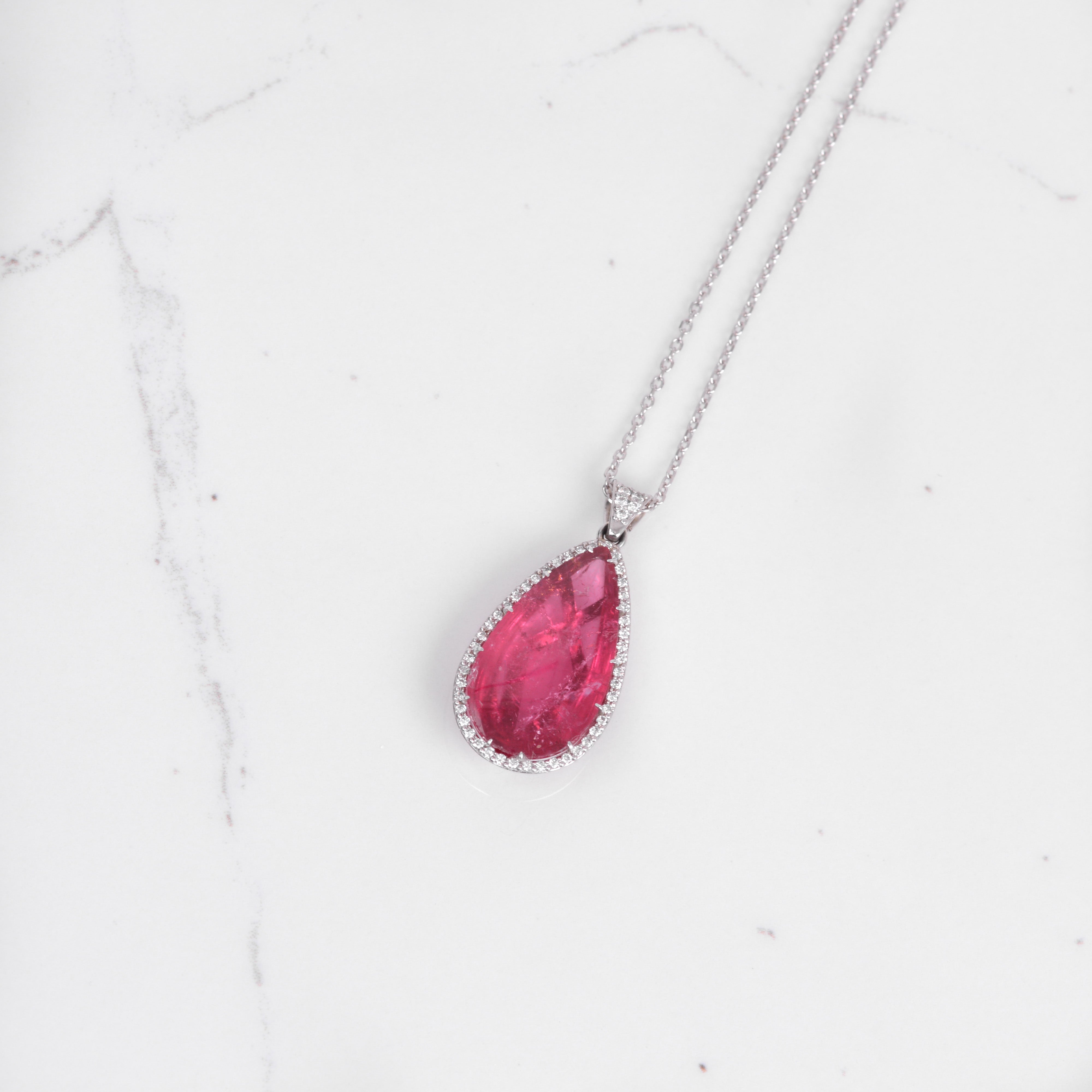 A remarkable 8.88 carat pear shaped rubellite, surrounded by a gorgeous white diamond halo. All tastefully set in 14k white gold. The pendant comes with an 18 inch adjustable chain, and the dimensions of the pendant are 27mm x13mm. |