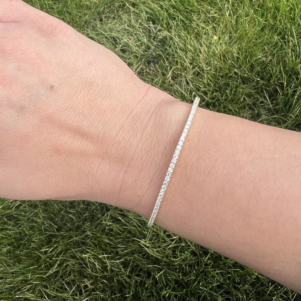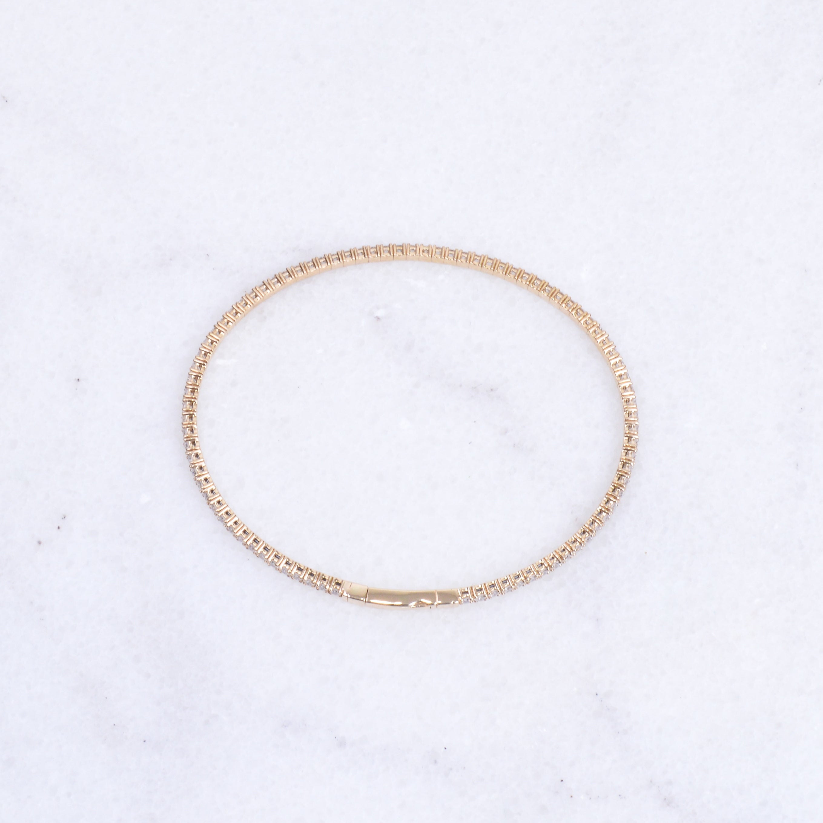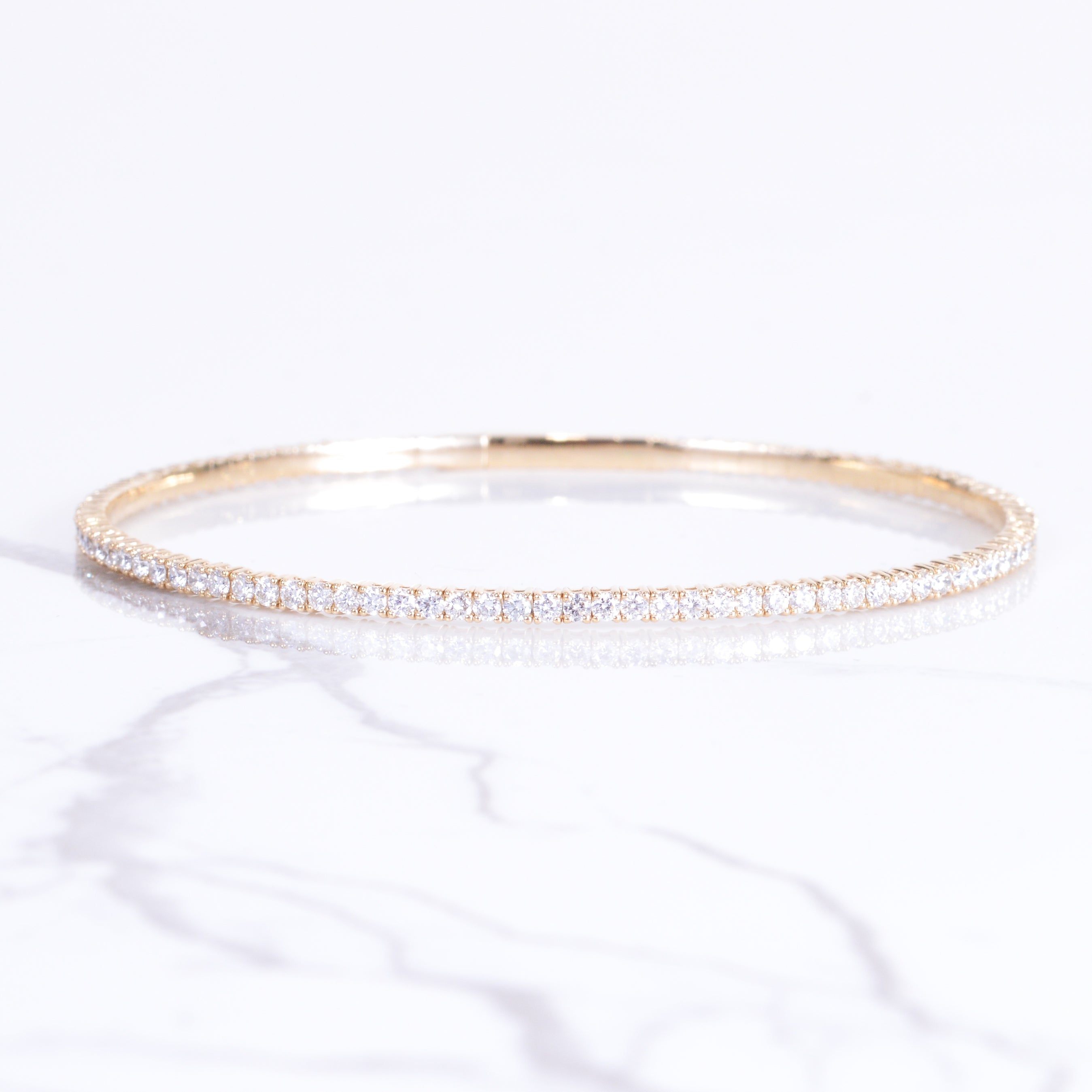 There is so much to love with this stunning diamond bracelet! The flexible design in this bracelet makes for a comfortable wear. There are a total of 2.42 carats of diamonds. These diamonds are F in color with VS clarity. All hand set in 14k yellow gold, and measures 7 inches.