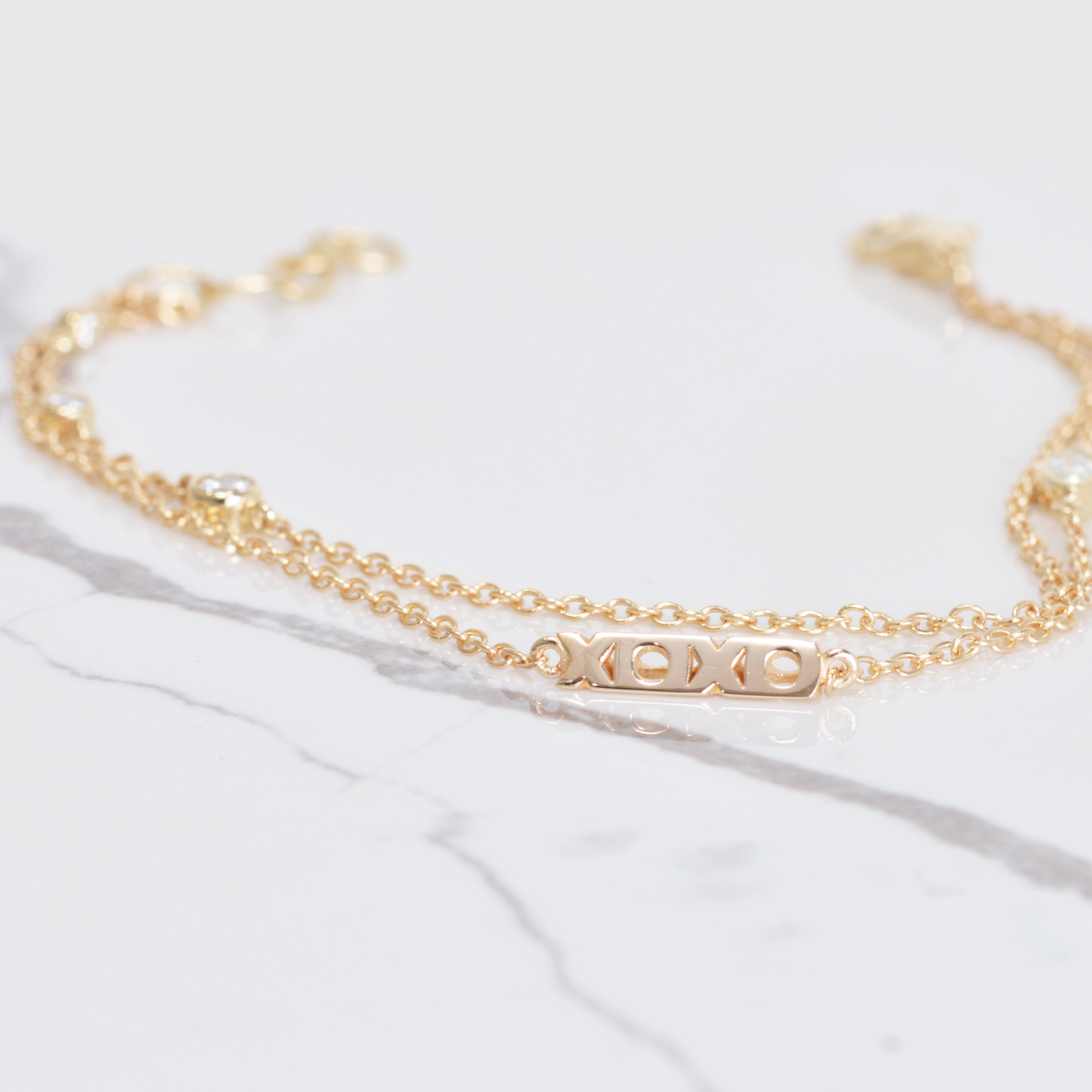 Can't feel nothing but love when wearing this stunning bracelet! This 14k yellow gold double chain bracelet has a XOXO rotating charm with beautiful diamond accents that total .39 carats. This bracelet measures 7-7.5 inches.