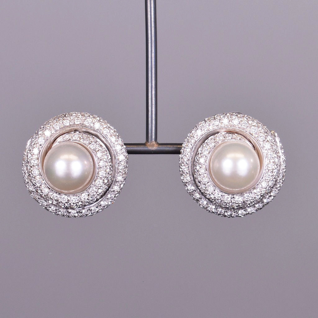Few jewels are as classy and timeless as pearls with diamonds! These earrings are gorgeous! 2.18 carats of diamonds swirl around 9mm pearls that have amazing luster. Set in 20 grams of 18k white gold. These earrings have posts and hinged French backs. They are 19mm in diameter or 3/4 of an inch. |
