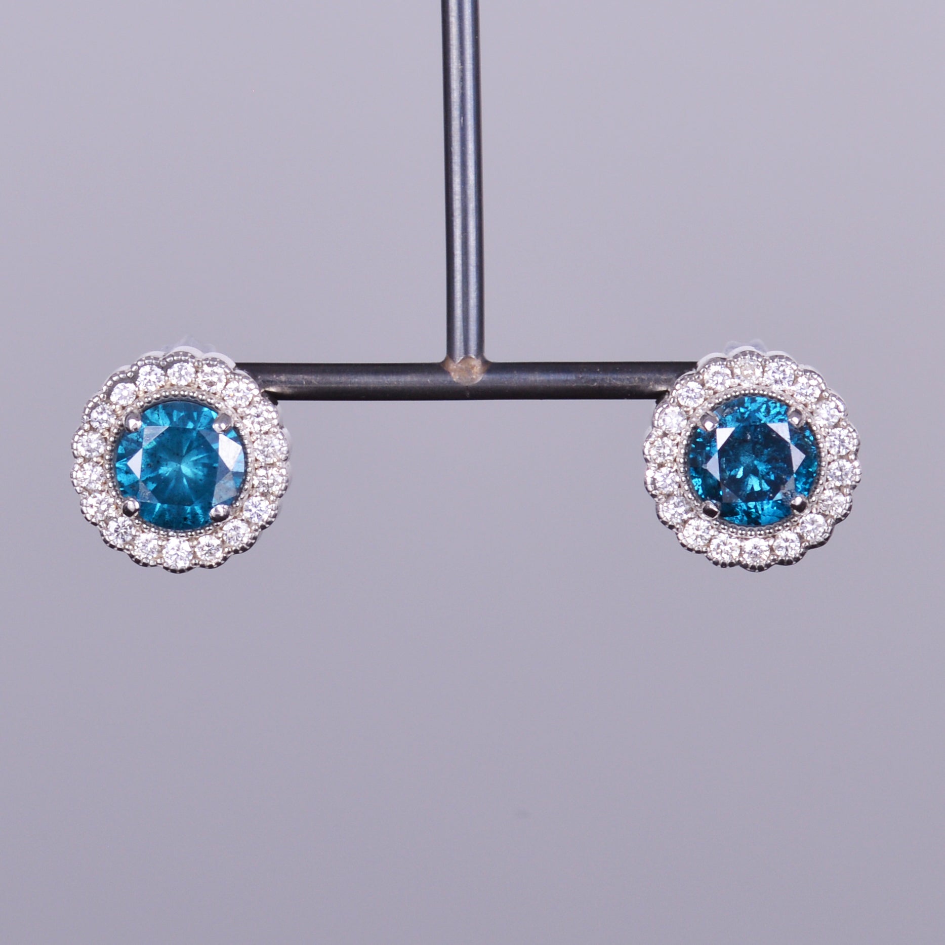 An enchanting pair of blue diamond stud earrings that truly glisten when worn! This pair of earrings has 2.48 carats of color enhanced (irradiated) blue diamonds, set in beautiful .58 carat diamond scalloped halos. All tastefully set in 14k white gold. Measuring 12mm in diameter.