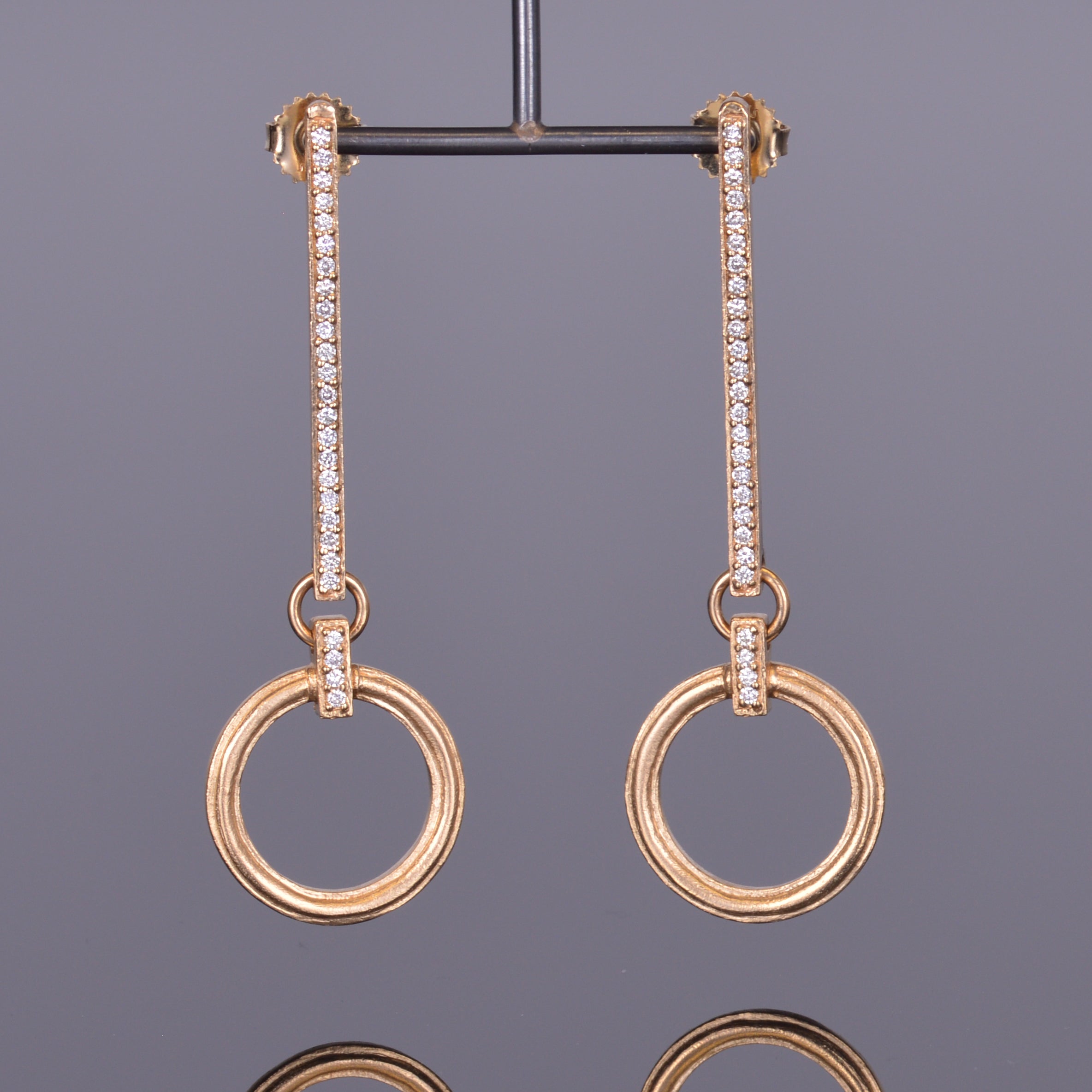 Simply enchanting.. With a mix of modern and old world design, the Gold Drop earrings are 1.06 carats of bright white diamonds meticulously set in 14k yellow gold with an aged finish. Over 2 inches long!