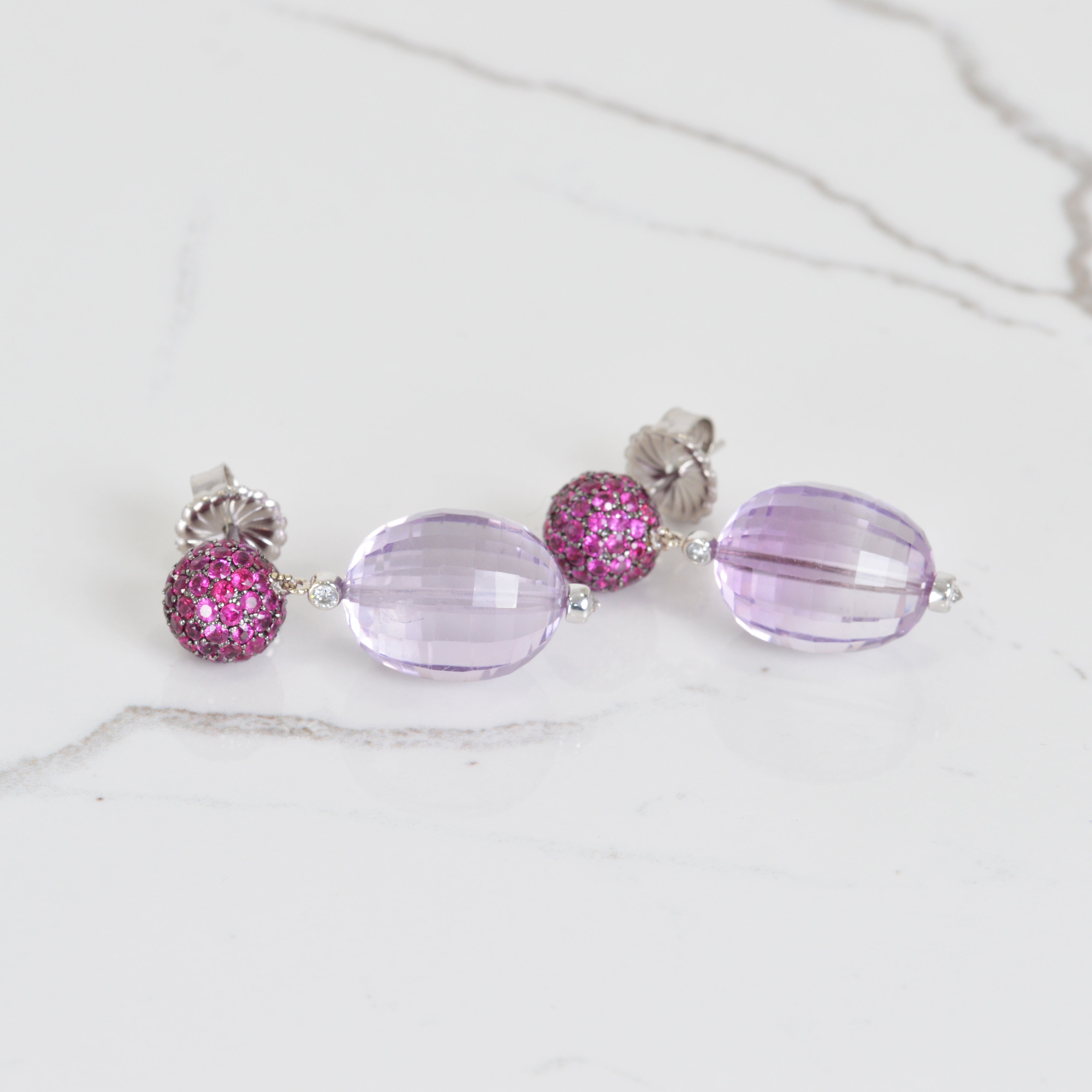 Pretty in pink! With ruby pave spheres, and amethyst briolettes with upside down diamonds capping off the bottoms. All set in 14k white gold. The length of these earrings are 32mm.