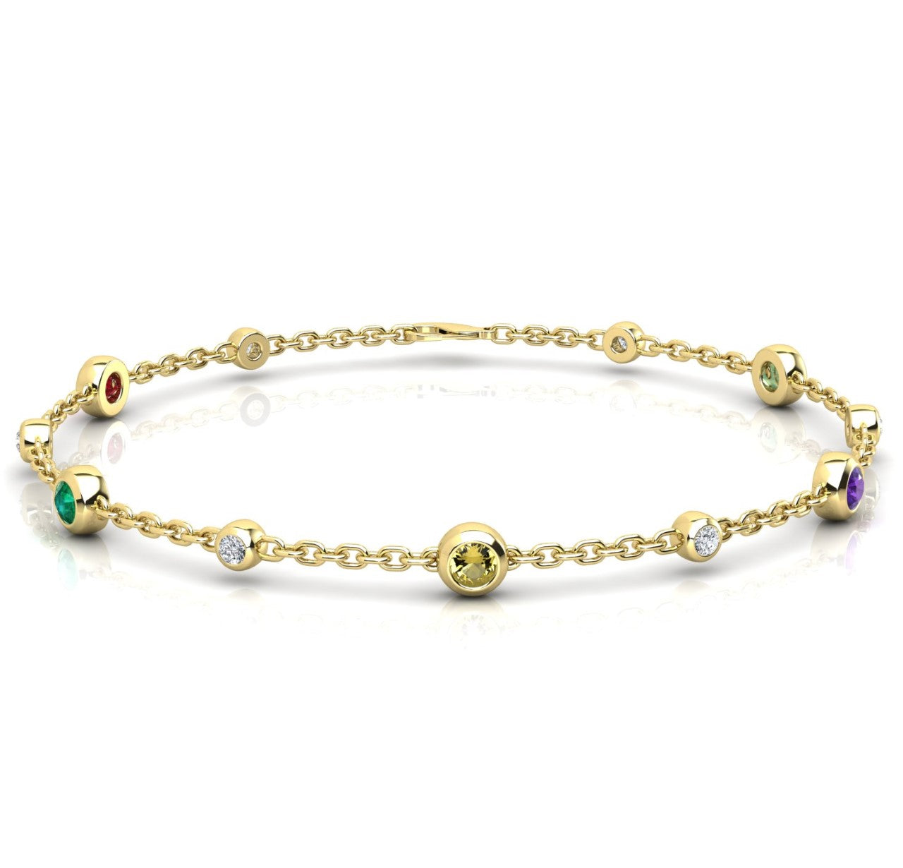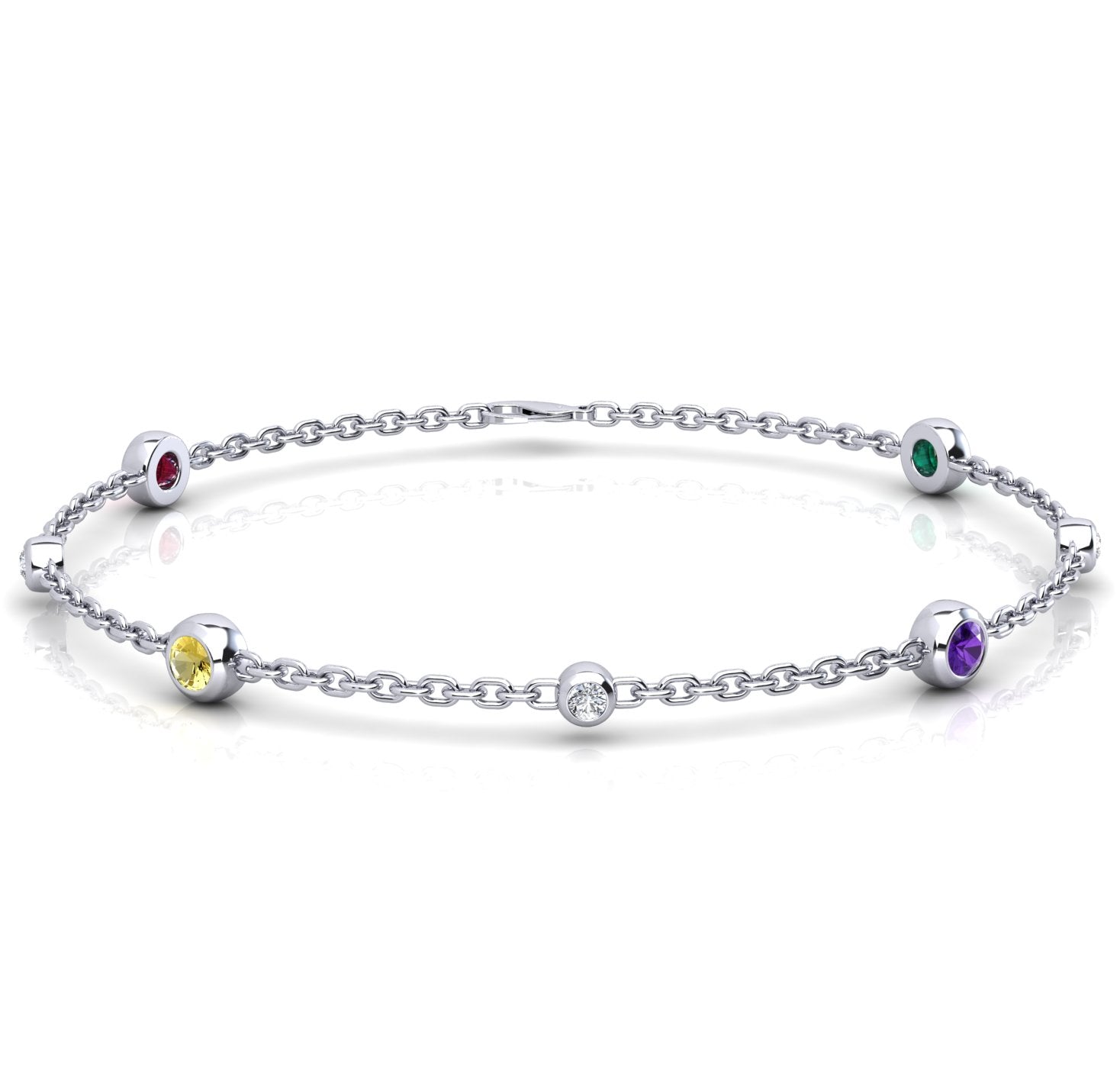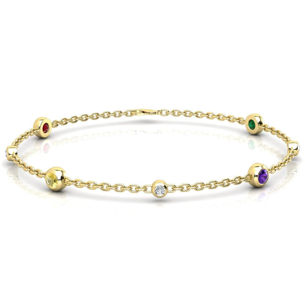 Let's create a new favorite piece of jewelry! This is a fully customizable birthstone bracelet. Any number of birthstones can be bezel set into your choice of white, yellow or rose gold. Let us know your choice of birthstones in the note section at checkout.