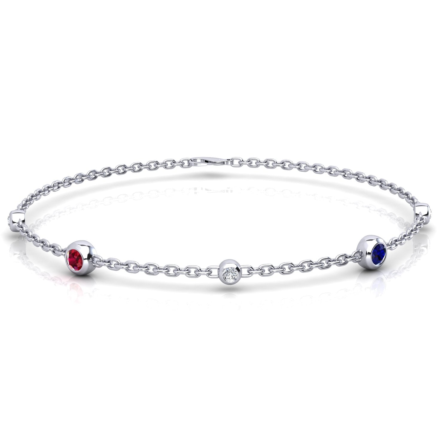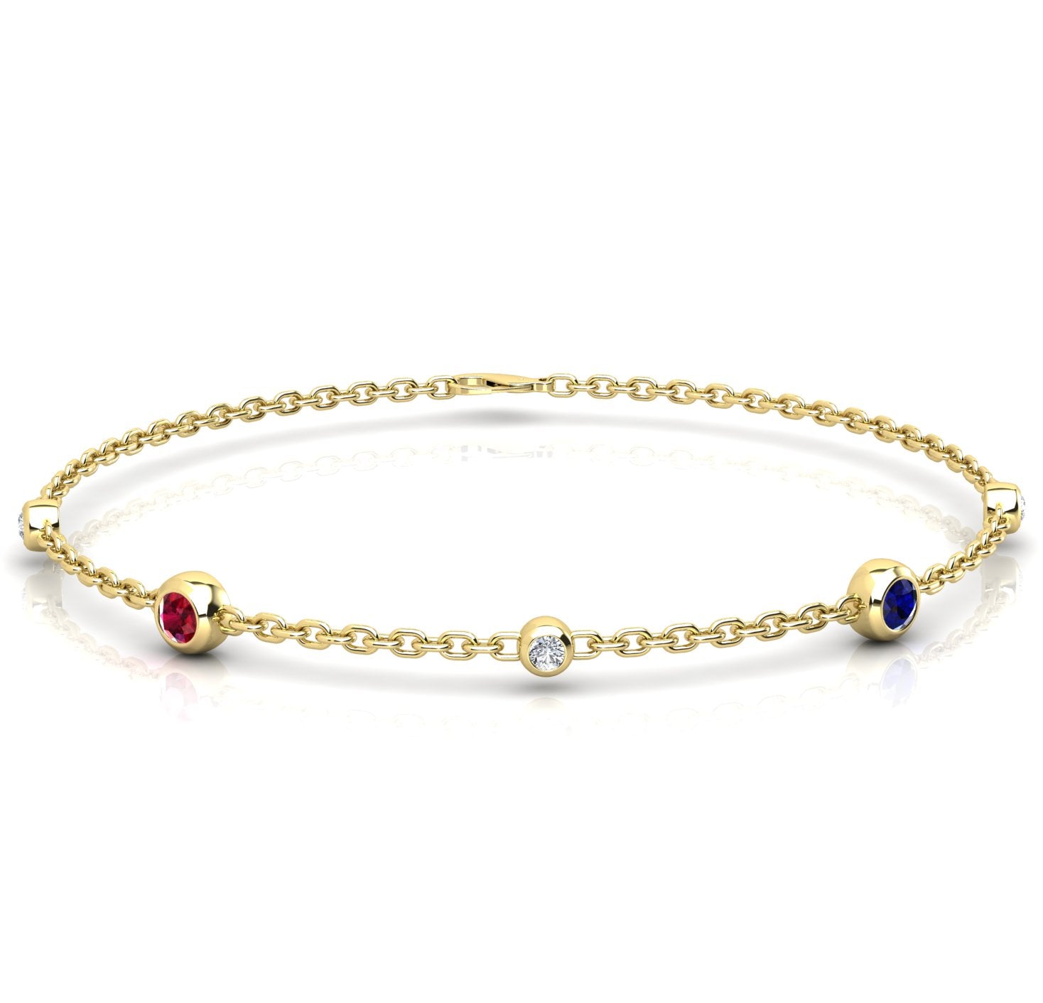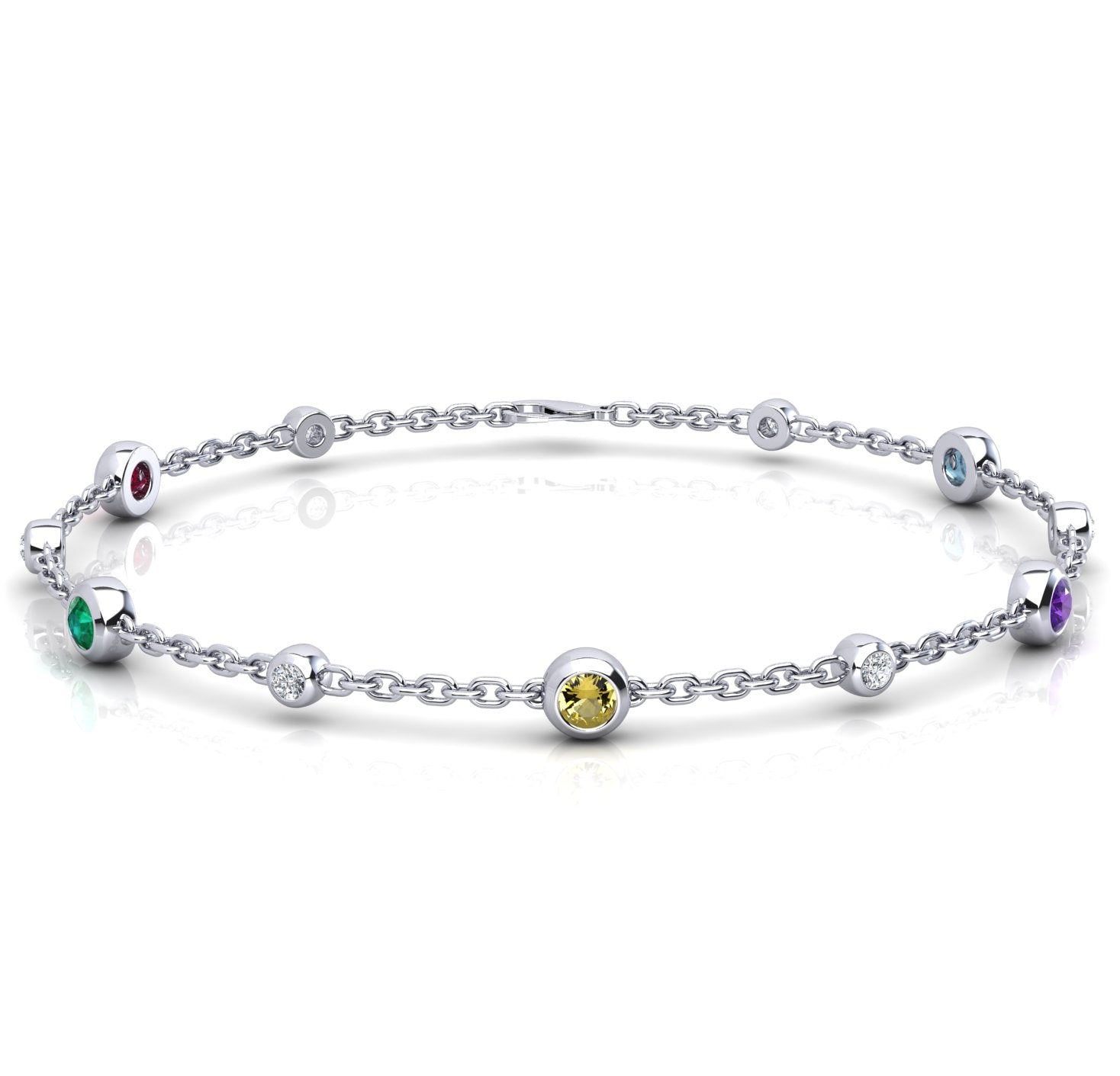 Let's create a new favorite piece of jewelry! This is a fully customizable birthstone bracelet. Any number of birthstones can be bezel set into your choice of white, yellow or rose gold. Let us know your choice of birthstones in the note section at checkout.
