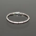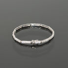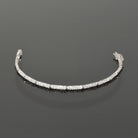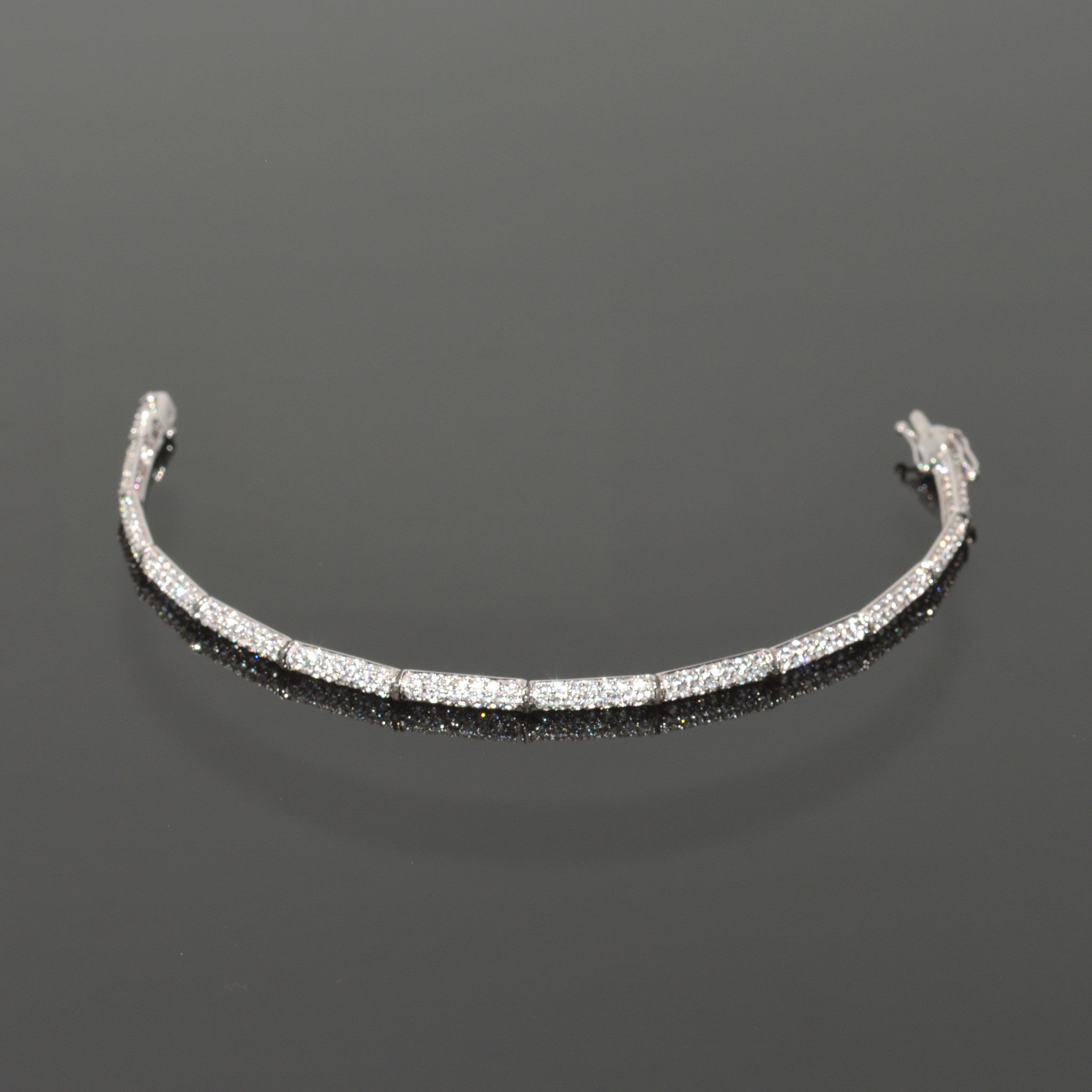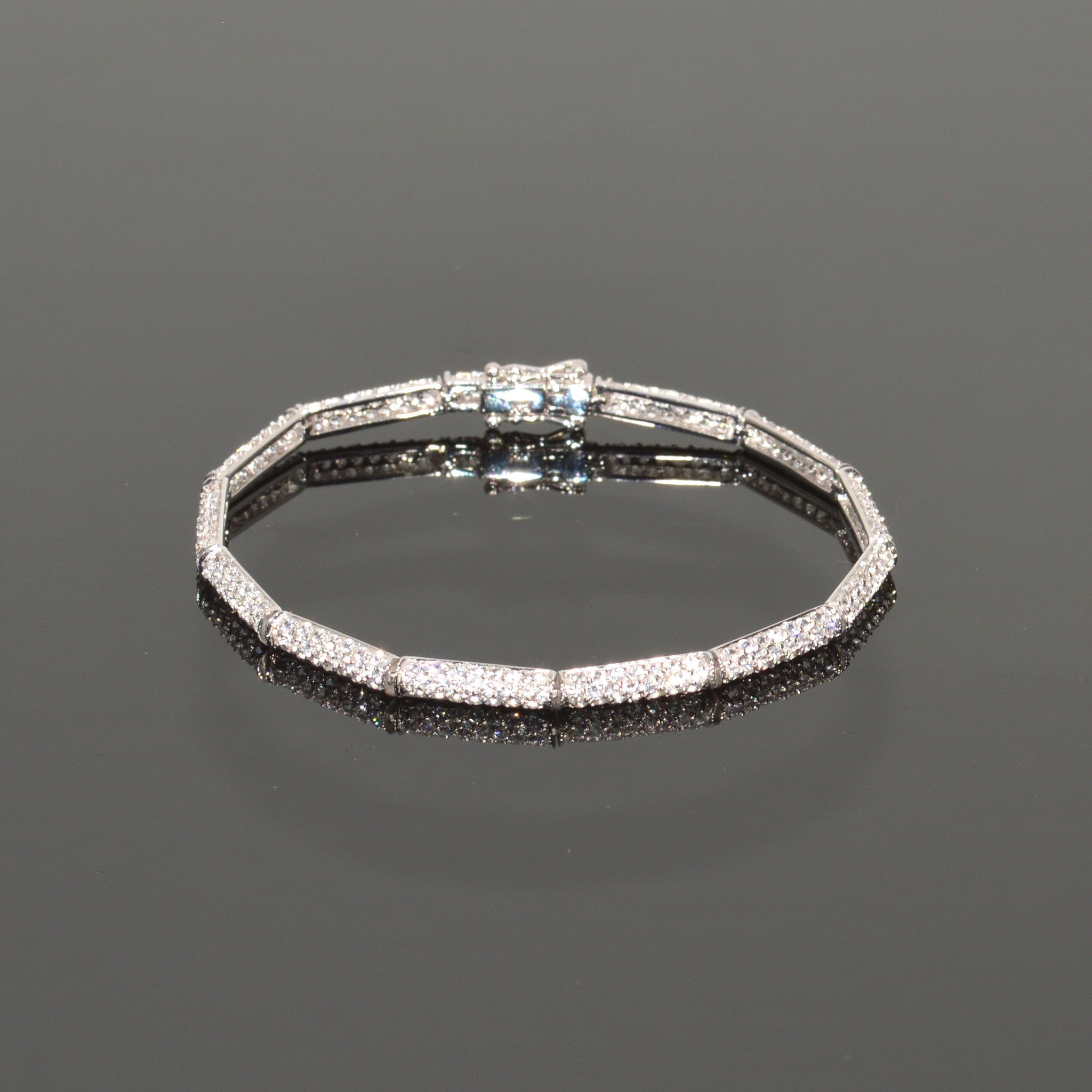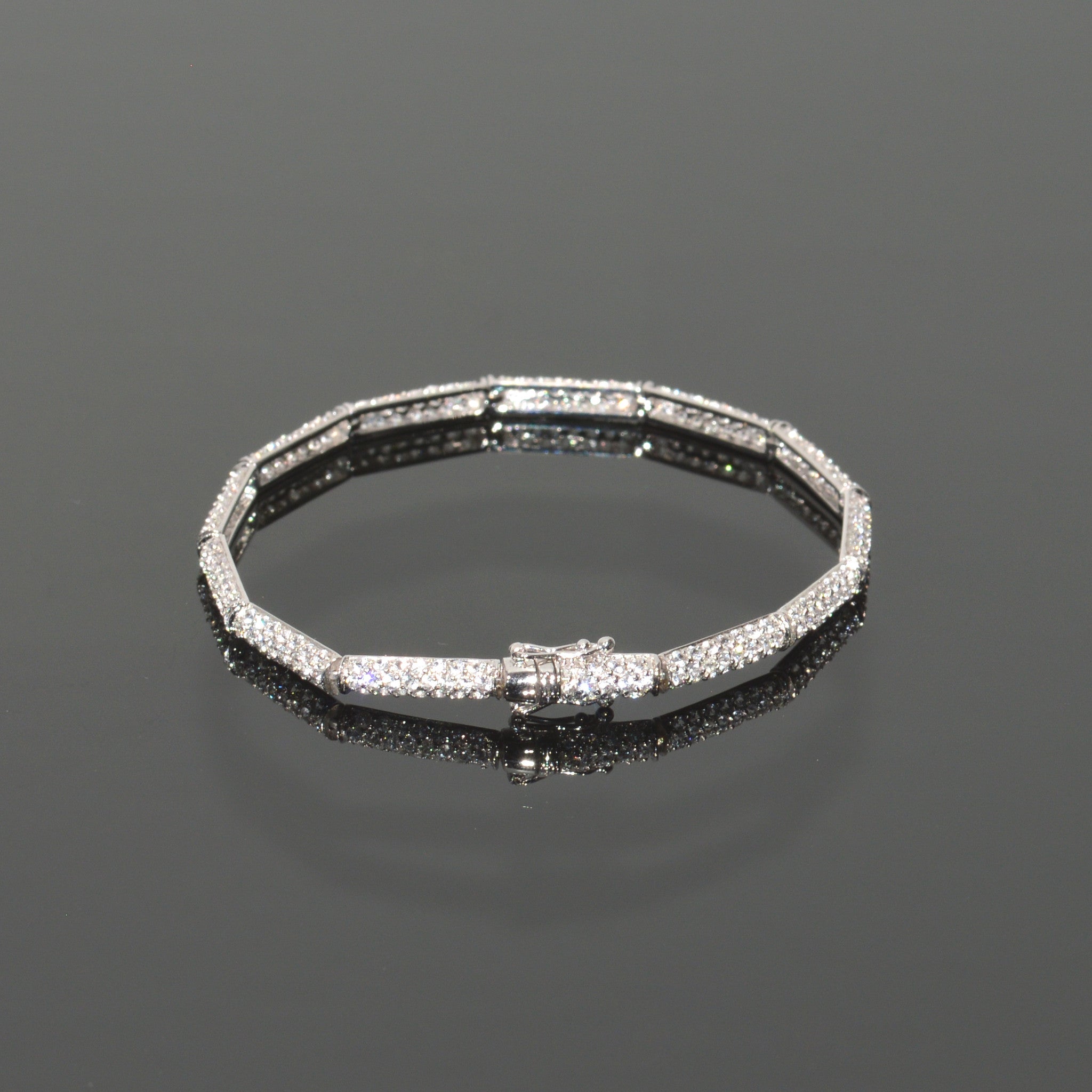Stunning pave bracelet set with 277 perfectly matched diamond cut white sapphires (4.56 carats). It lays perfectly with 13 separate 14k gold panels seamlessly fashioned revealing a continuous stream of blinding gems. The perfect compliment to the Flare Pave Necklace.