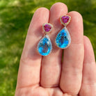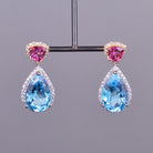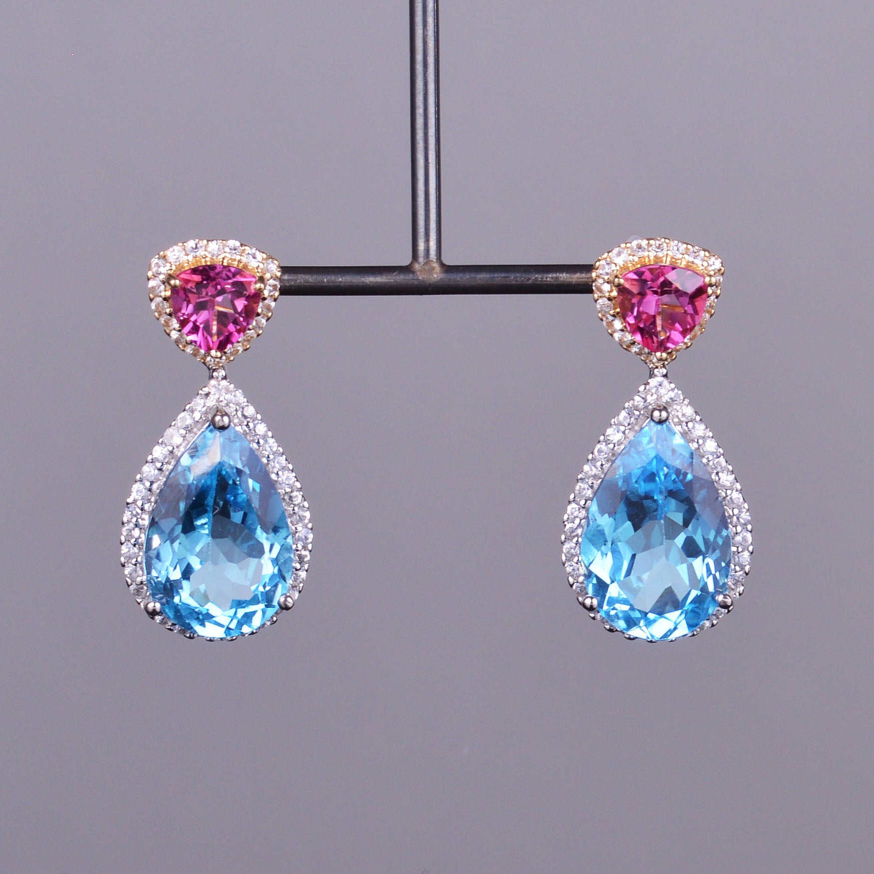All time best sellers! Stunningly designed with blue topaz flanked by pink topaz surrounded by diamond cut white sapphires in 14k white and yellow gold.