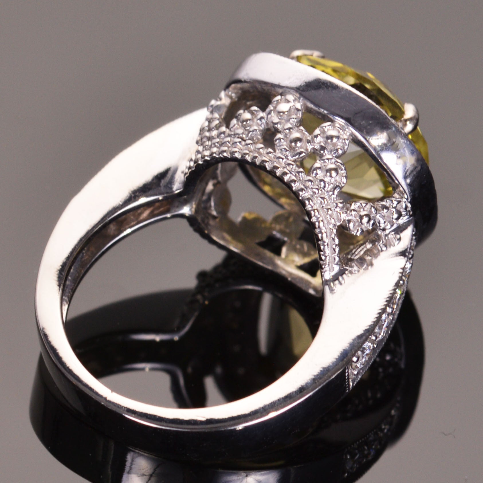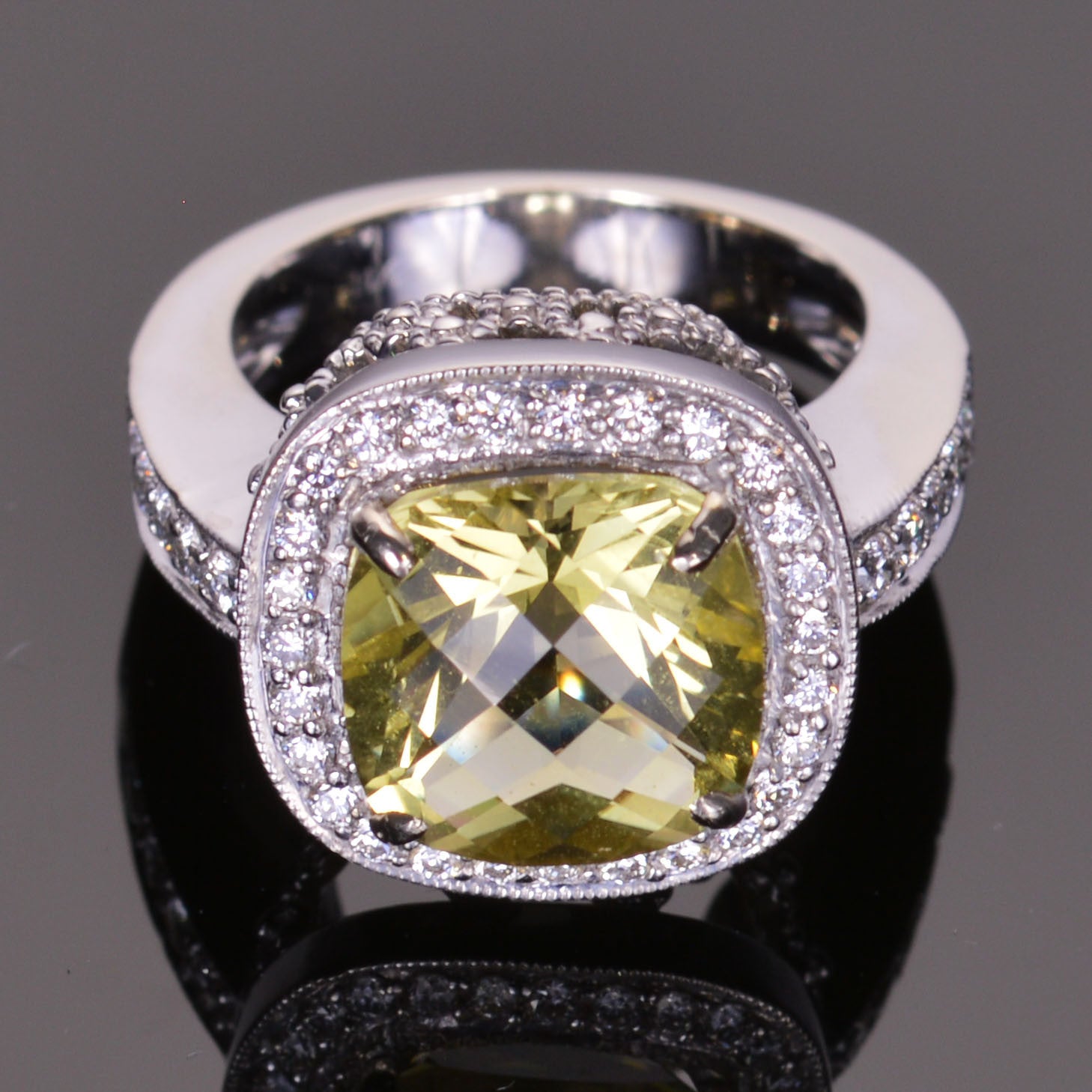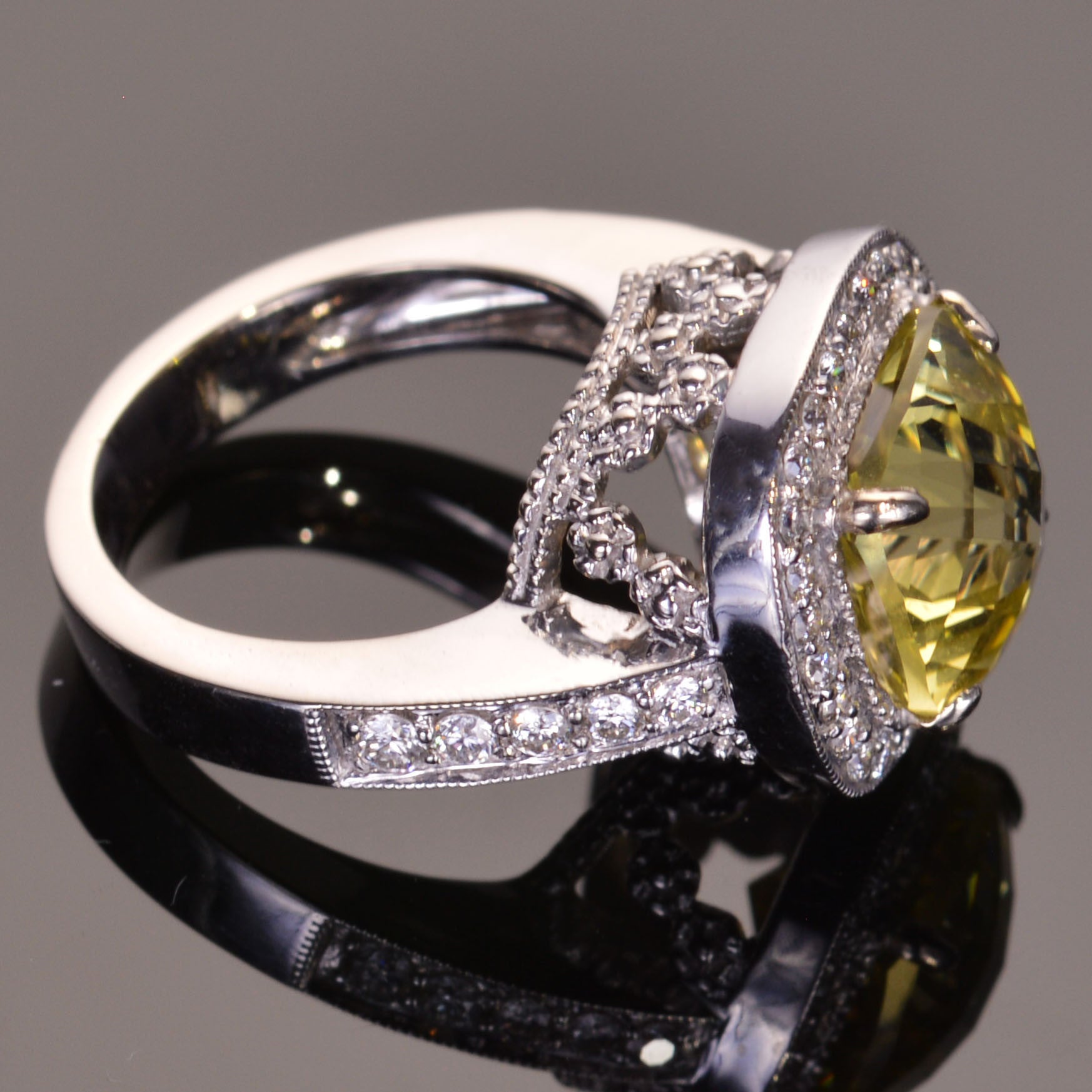 3.5 carats of lemon topaz decadently framed .50 carats of brilliant diamonds all set in 14k white gold.