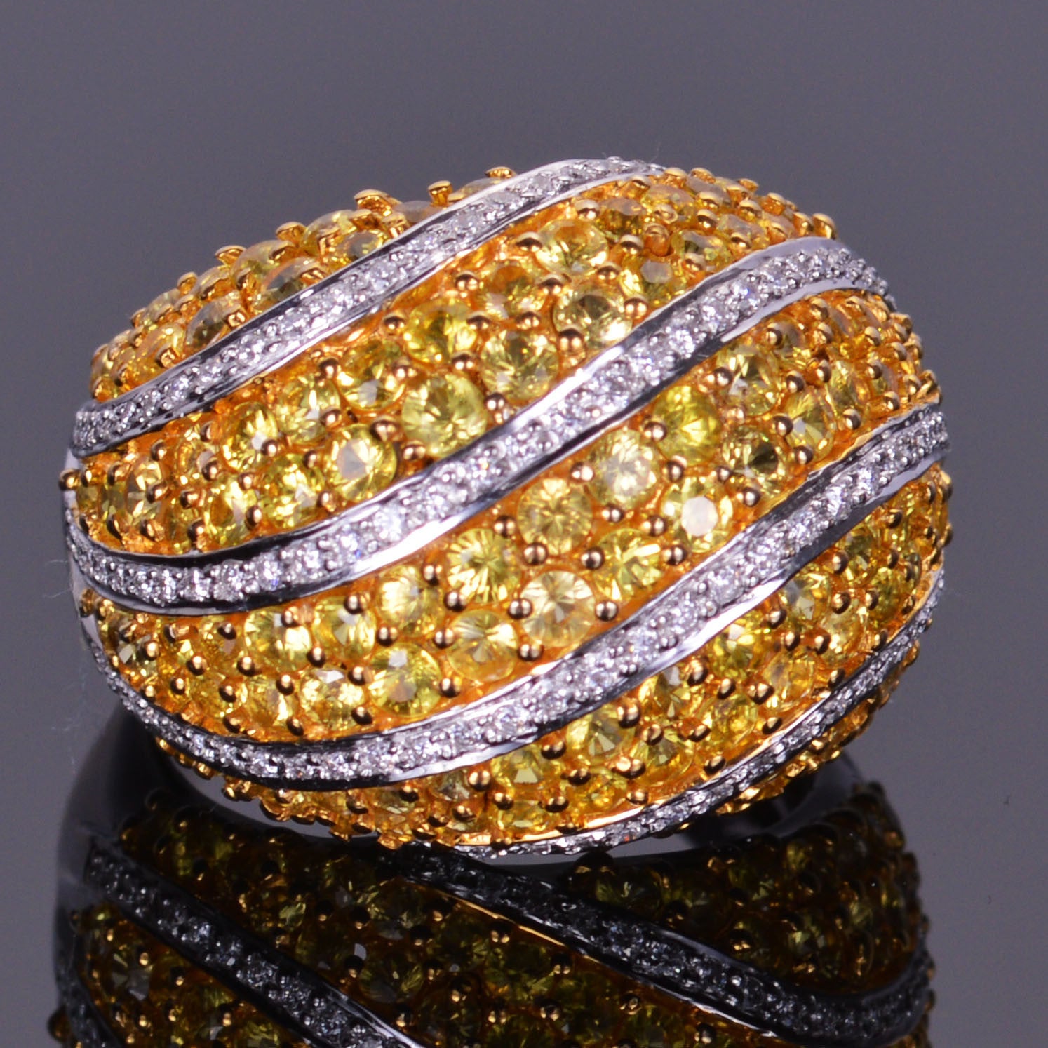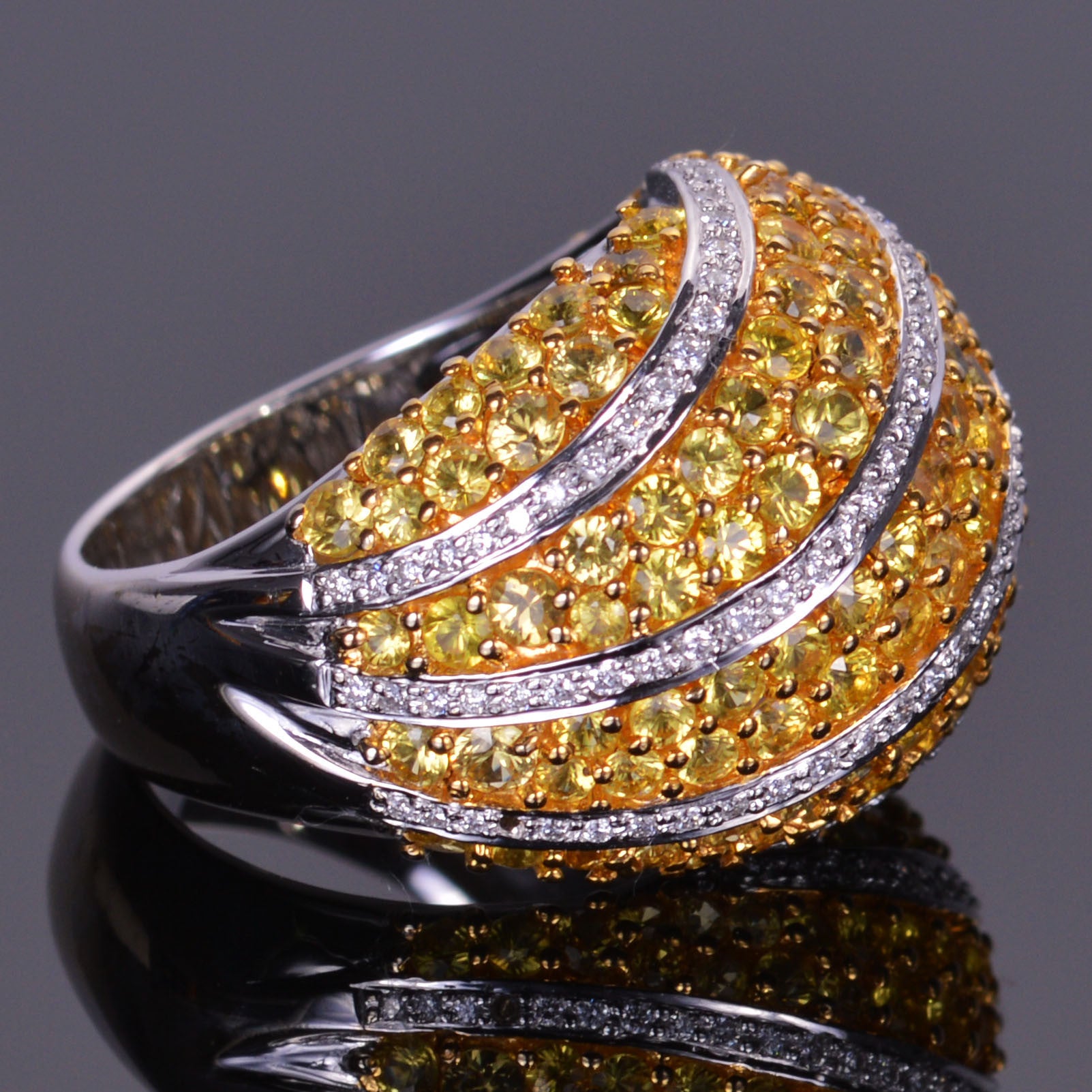 In the style of Chopard, this fun cocktail ring is made of swirling rows of fiery yellow sapphires alternating with rows of brilliant pave diamonds. A total of 4.3 carats of sapphires and .36 carats of diamonds is set in 18k white gold. |