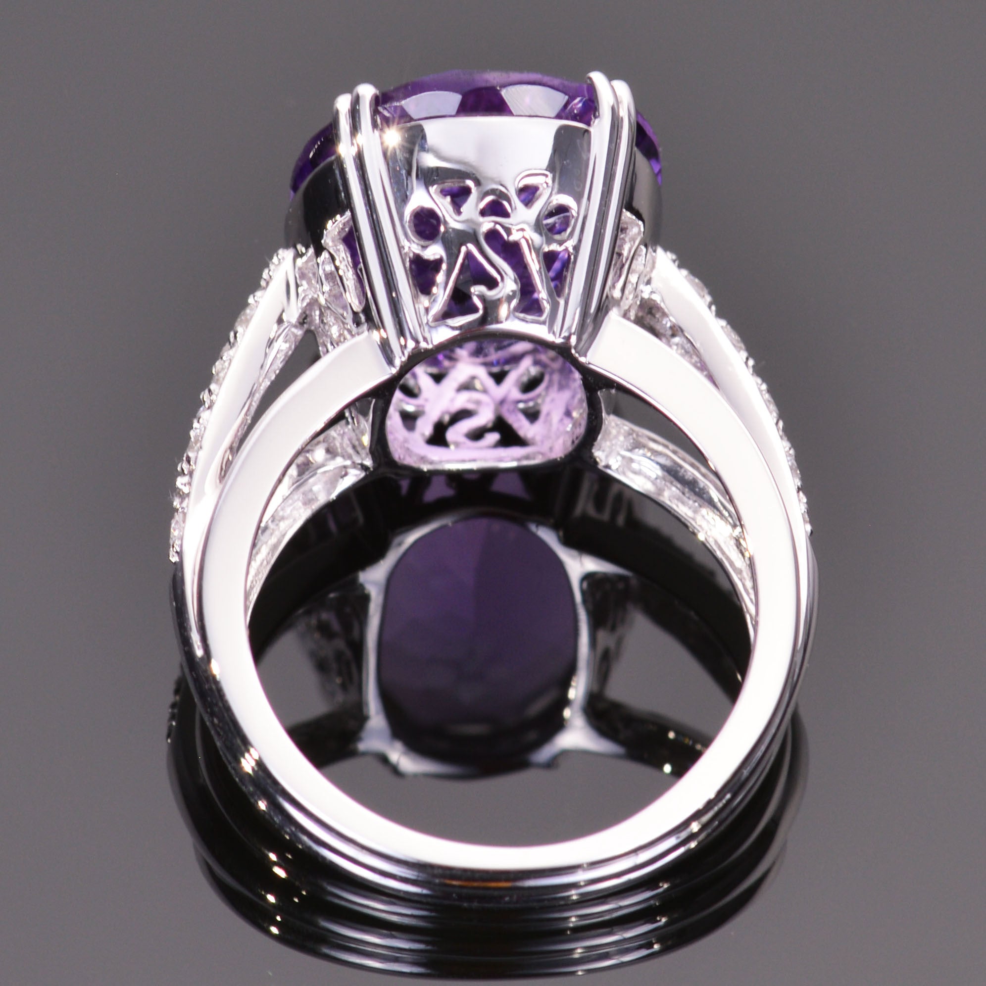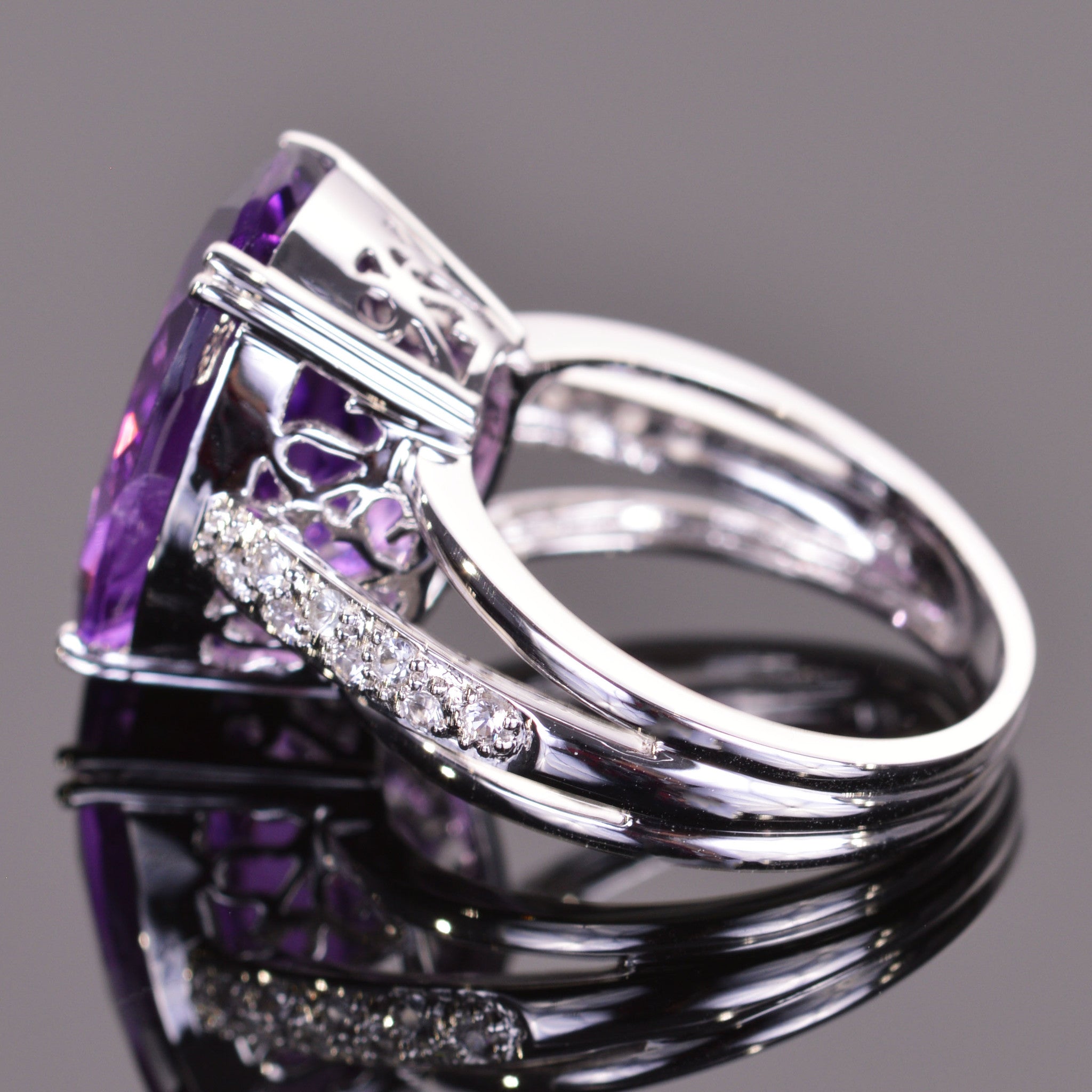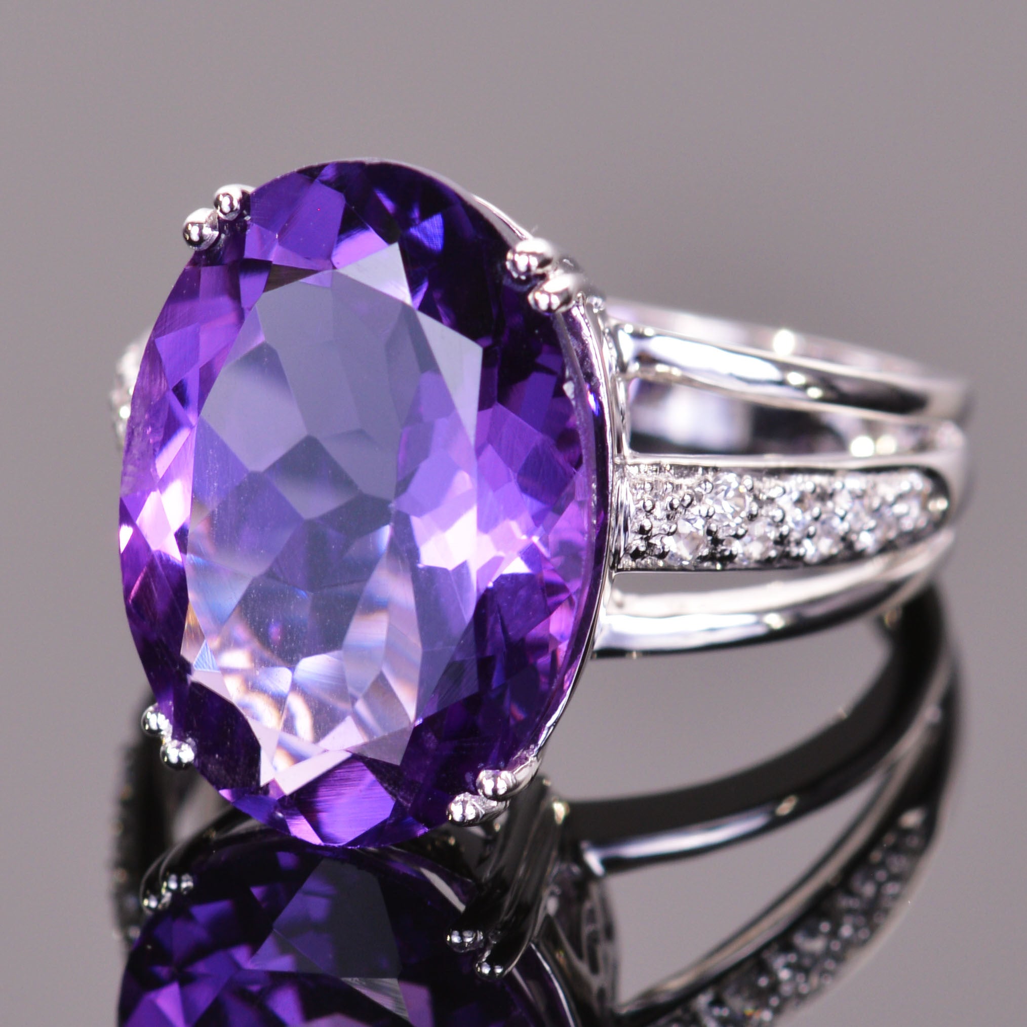 This ring's elegant amethyst center stone is a large 12.17 carat oval cut. Over .26 carats of dazzling White Sapphires cascade down each band of the ring creating an elegant eye catcher. Beautifully cast in solid 14K white gold.