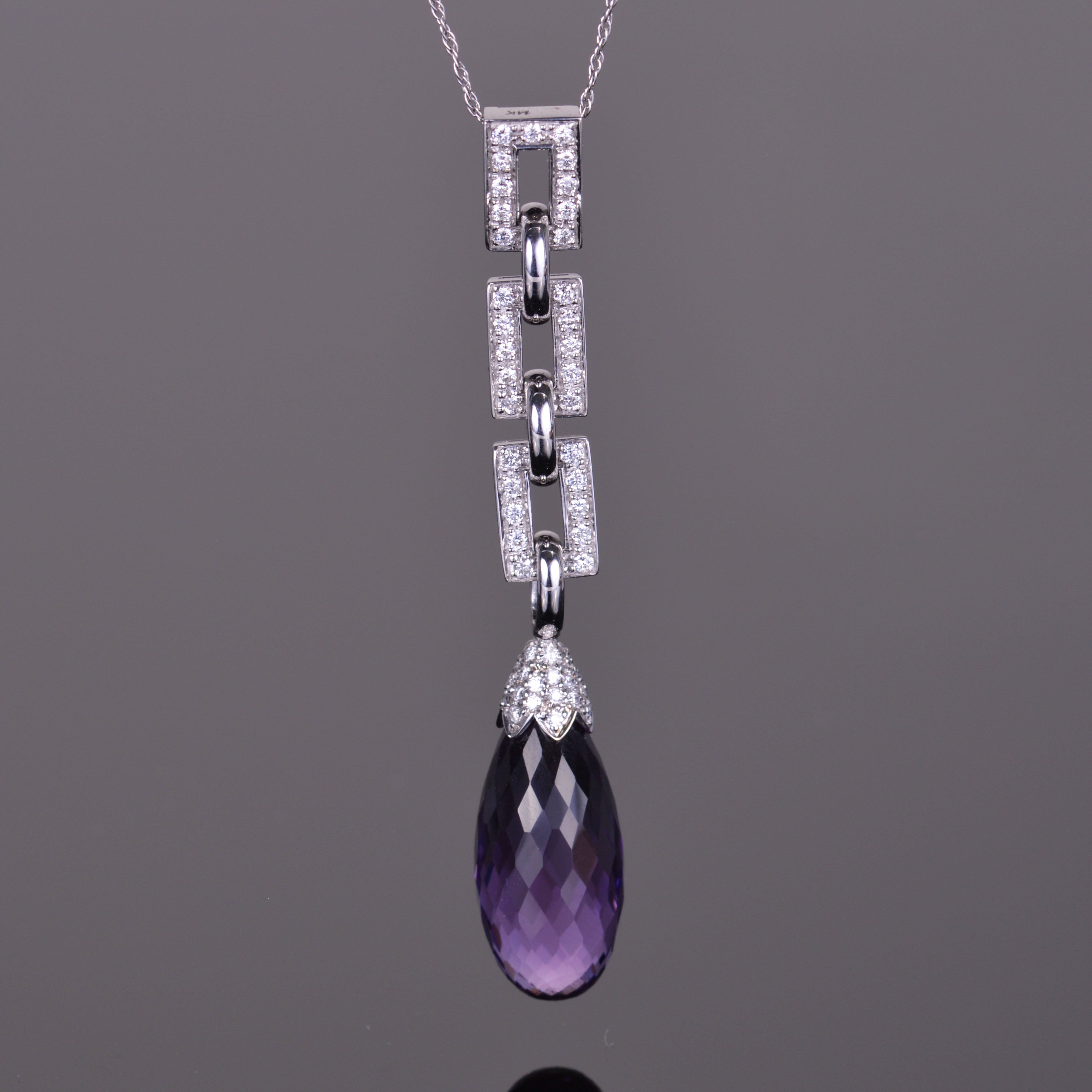 Amethyst and diamond briolette pendant with 13.54 carat Amethyst and .41 carats of white diamonds set in 14k white gold. The measurement of this beautiful pendant is 52.26mm x 9.13mm, and it comes with a 14k white gold chain.