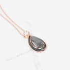 This diamond pendant is truly unique and absolutely stunning! The pear cut black diamond in the center is 3.18 carats, and accenting that beautiful stone is a .31 carat white diamond. All set in 14k yellow gold, with black rhodium around the black diamond. The measurements of the pendant are 27mm x 14mm.