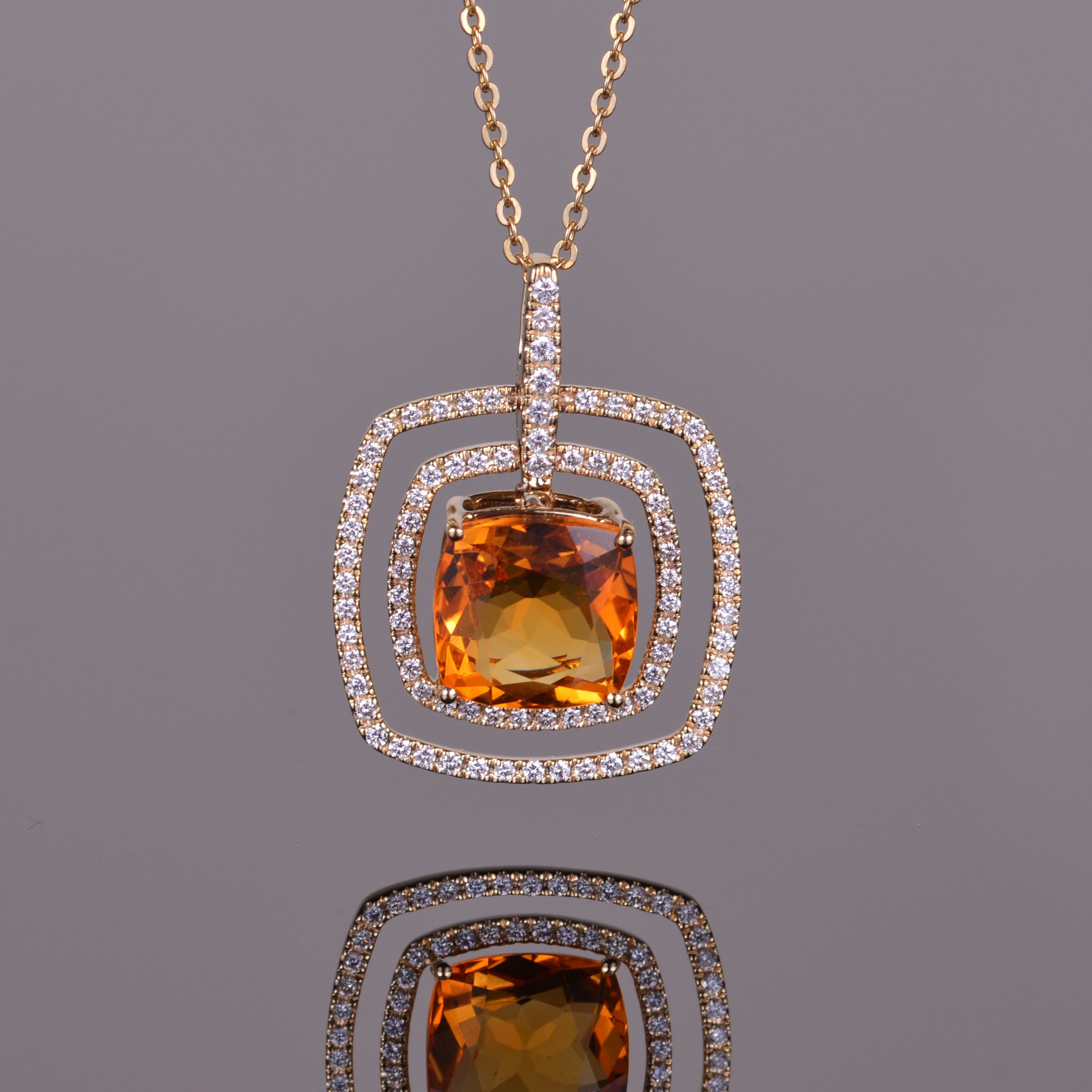 The cushion cut precious colored gem appears to float in a double frame of sparkling diamonds. The unique setting lends an element of motion to the pendant that is both eye catching and elegant. Handset in the pendant is 88 fine quality diamonds. This pendant has a 4 carat golden citrine. The measurement of this pendant is 25.89mm x 20.11mm