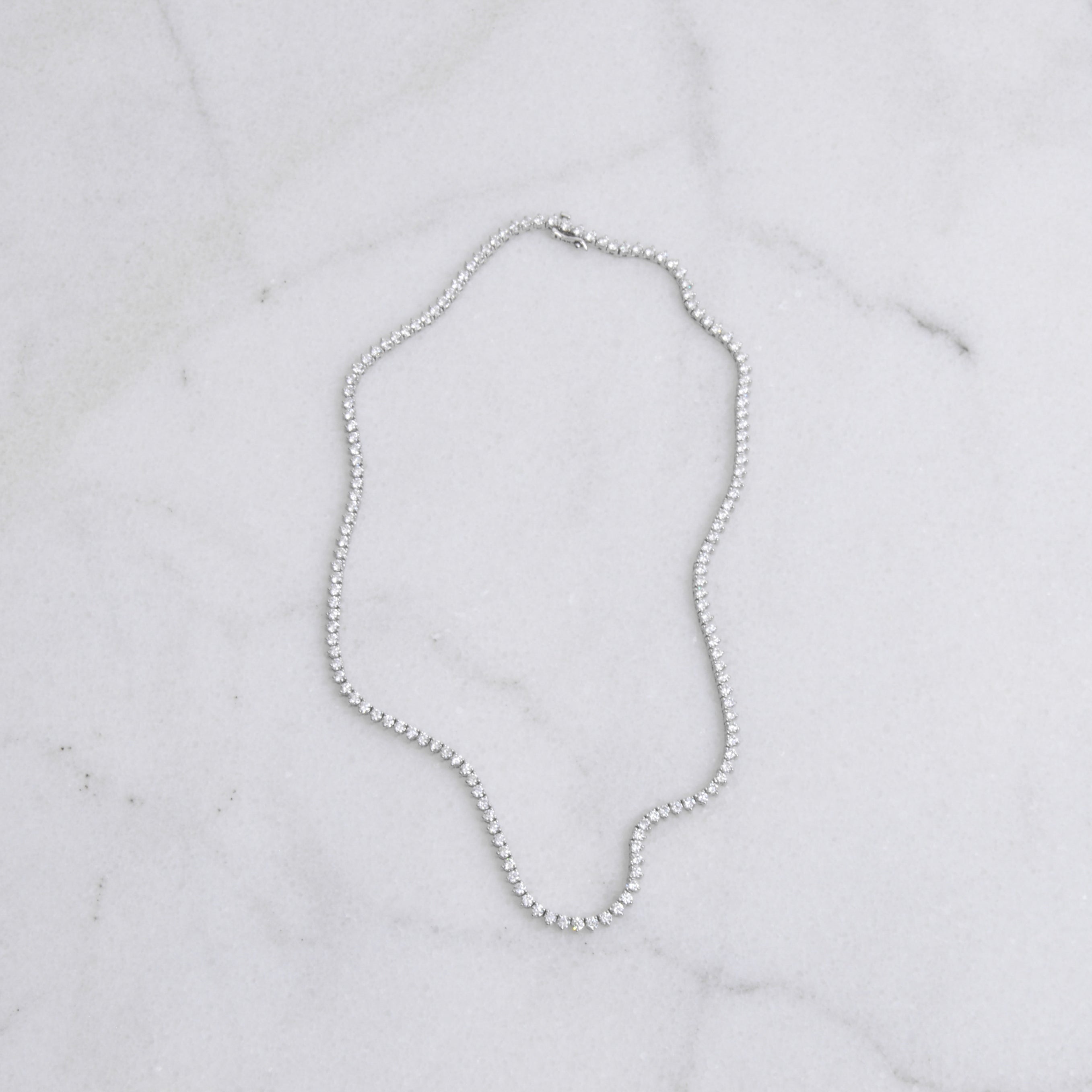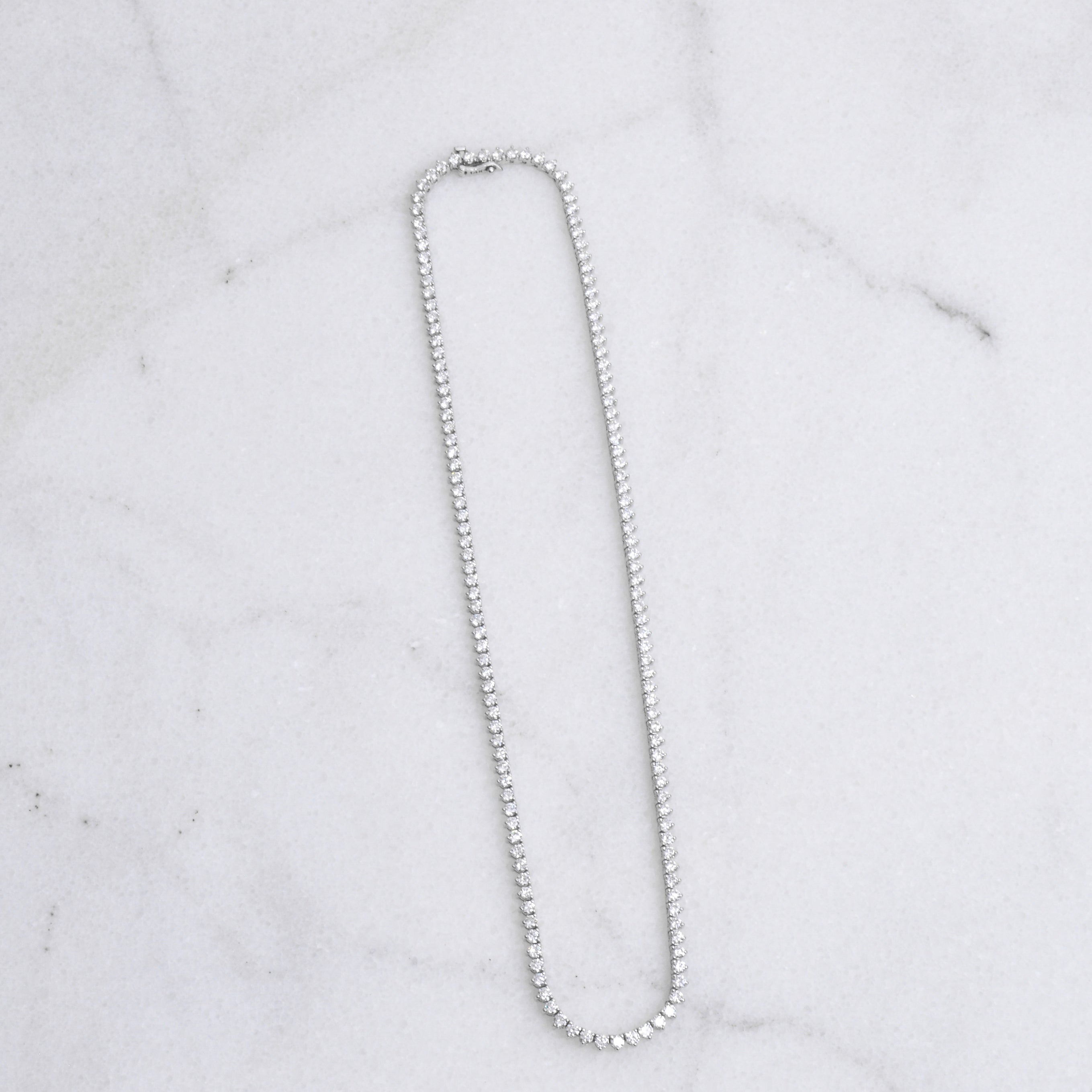 This diamond necklace is nothing but classy and stunning! This exquisite necklace has a total of 10.50 carats of diamonds that are F in color with VS clarity, all hand set in 14k white gold. It measures 17 inches length. This piece looks incredible on its own or layered with other necklaces.