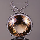 An extravagant 259.13 carat imperial topaz surrounded by 1.36 carats of white diamonds with ruby eyes. This beautiful topaz is held in place by four polished snake heads with the queen snake at the top. The measurement of this gorgeous pendant is 54.18mm x 40.02mm. All making this to be one eye catching piece.