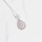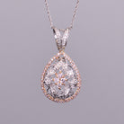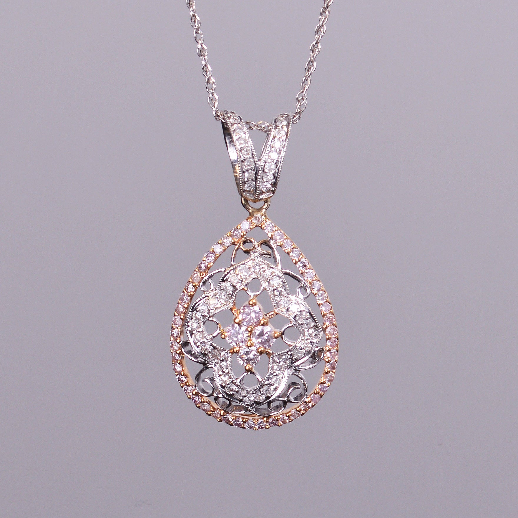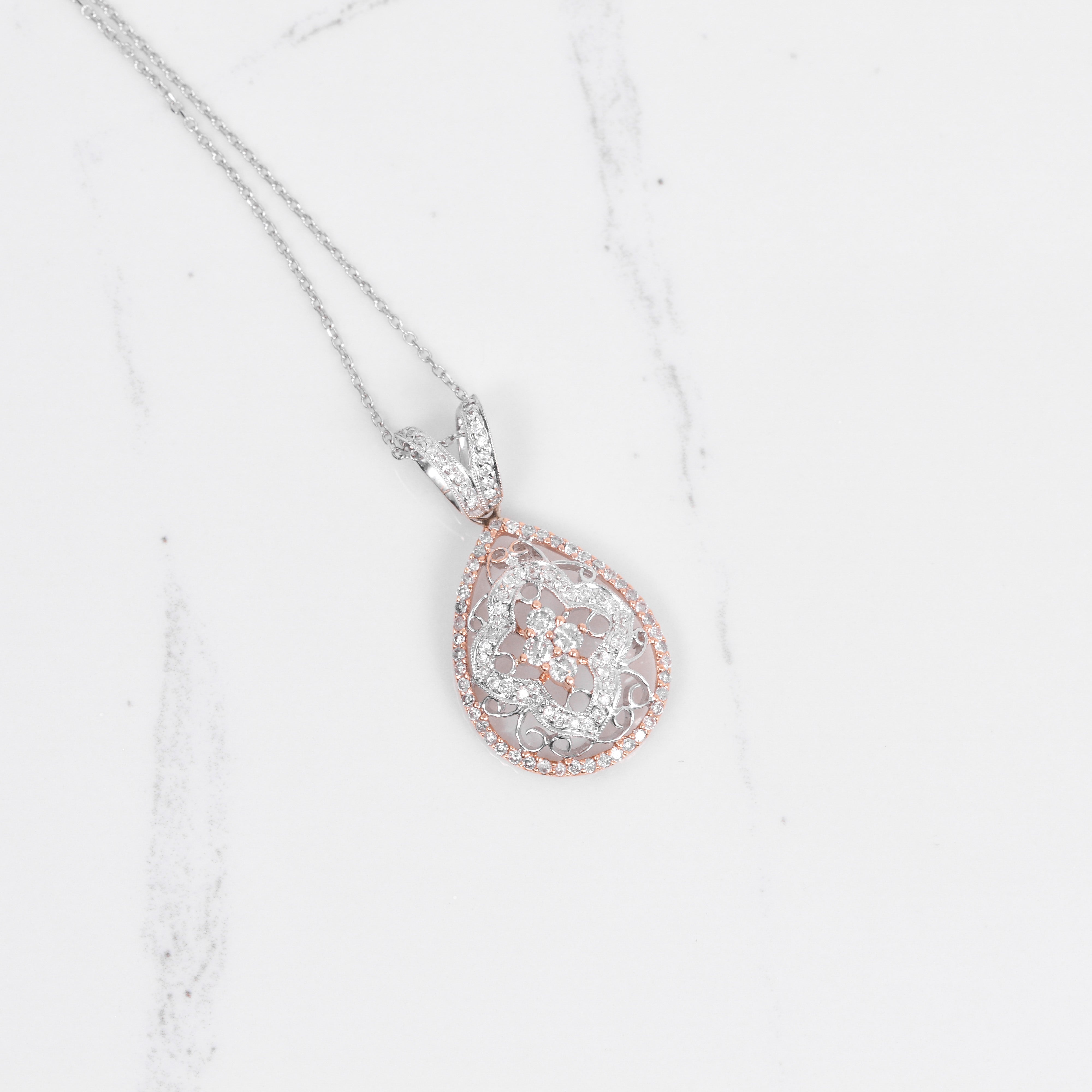 A vintage inspired pendant that has .76 carats of beautiful white diamonds, all set in 18k white and rose gold. Dimensions are 32.3mm x 16.92mm.