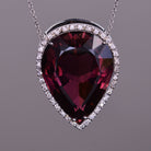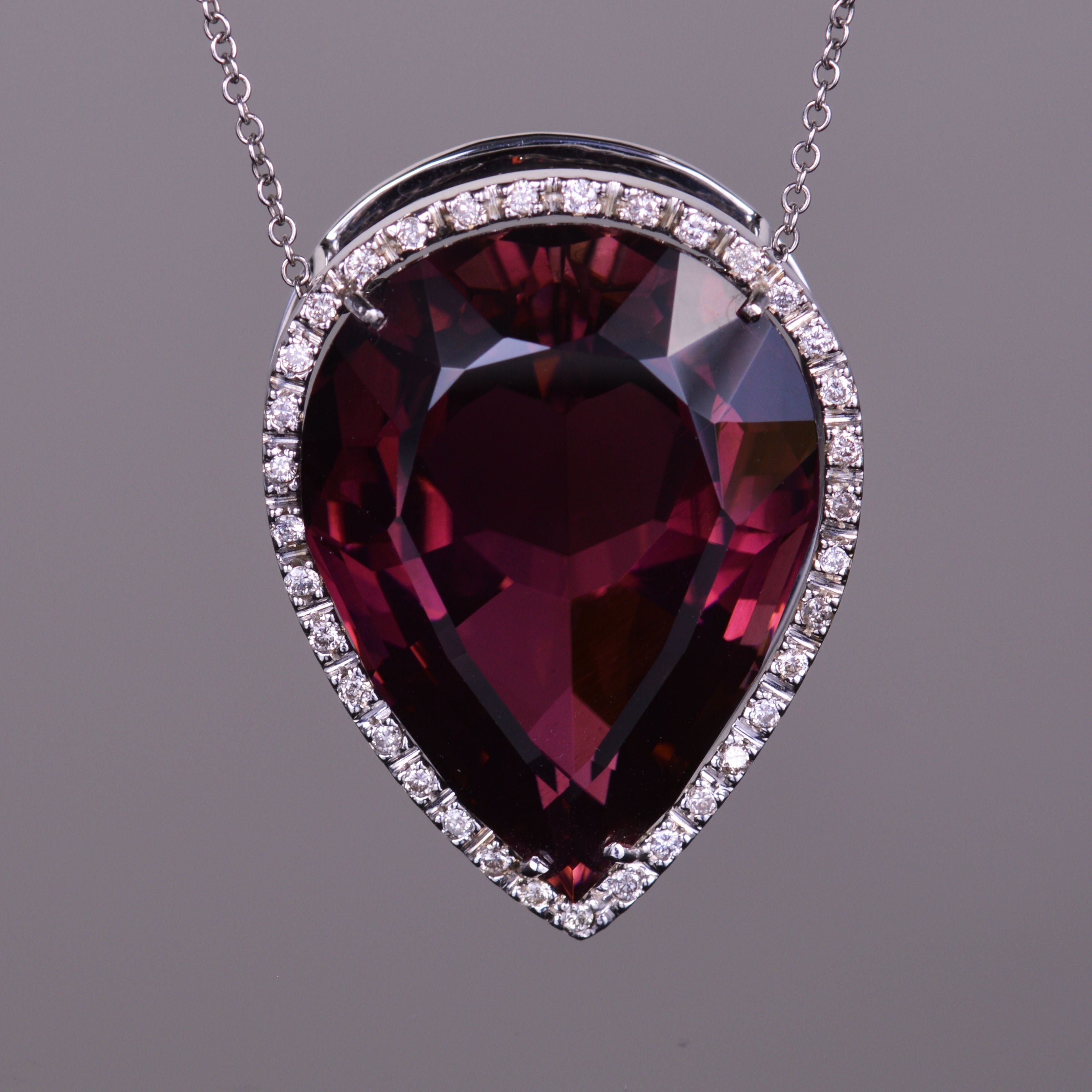 A gorgeous 34.18 carat pear shaped rubellite surrounded by a halo of .62 carats of diamonds. All set in 14k white gold.