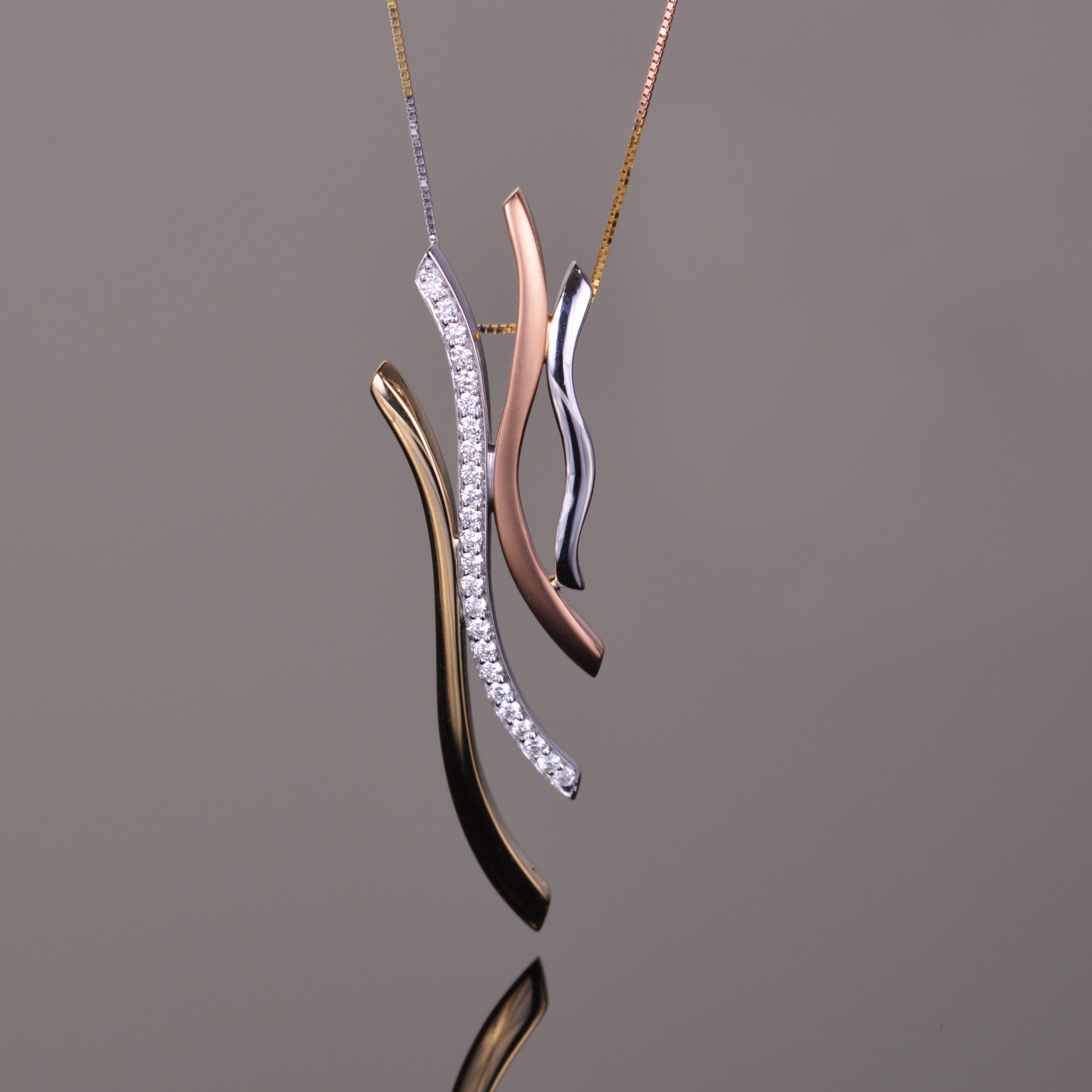 The Mirage combines the beauty of 14k yellow gold, white gold and satin finished pink gold along with fiery white diamonds to create a unique and mesmerizing collection. Includes three tone gold chain.