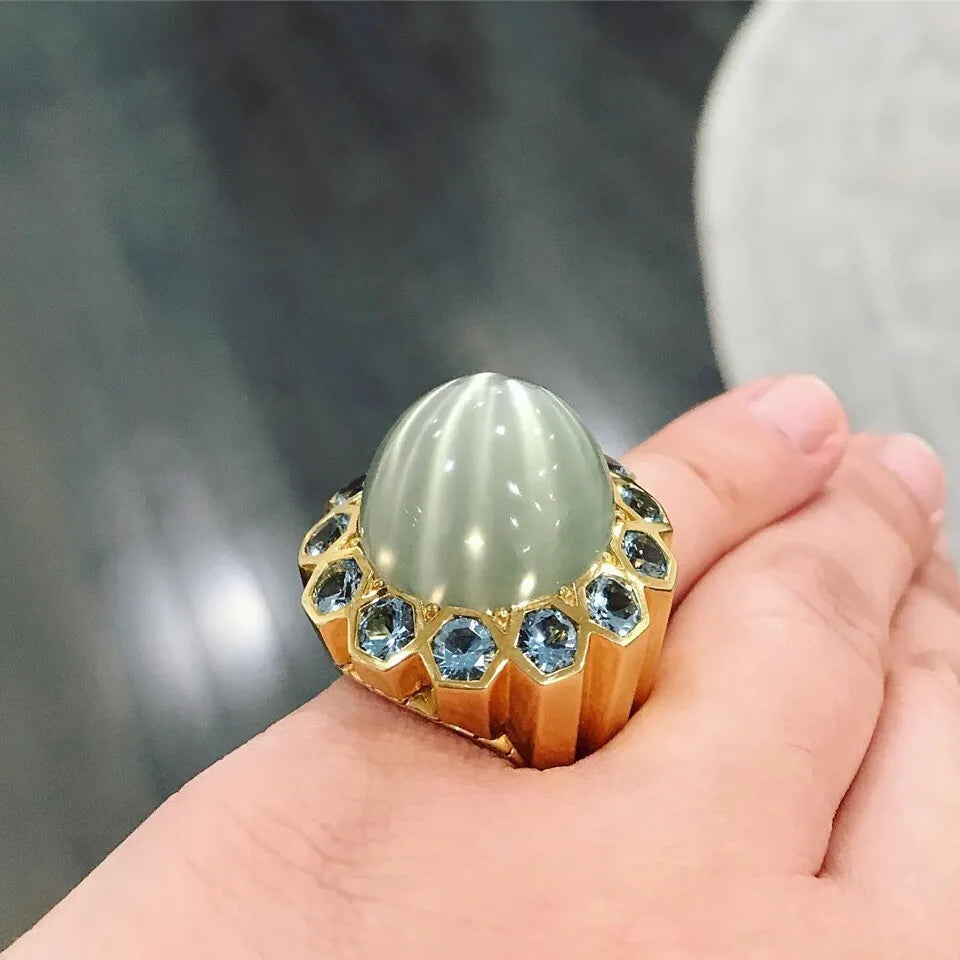 This John Hardy ring is glamorous to wear! With an alluring 38 carat moonstone in the center, surrounded by beautiful blue stones. All set in 18k yellow gold. Ring is preowned. Ring size is a 6 and weighs 40 grams.