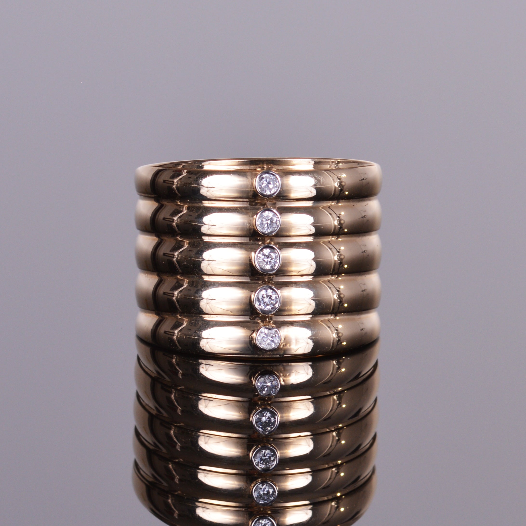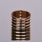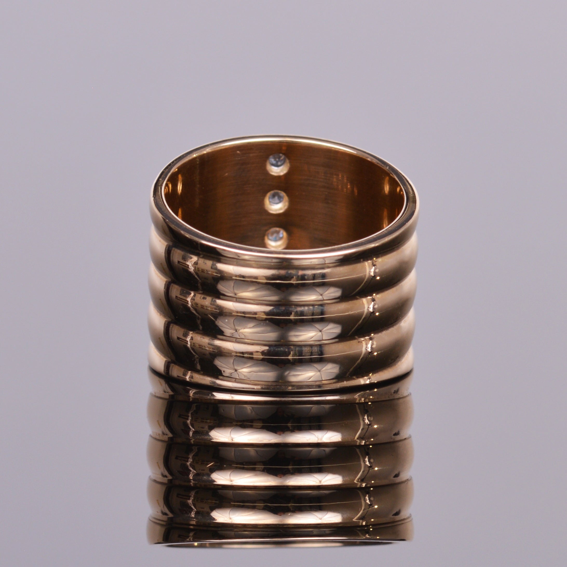 This cuff ring is delicate and beautiful! With a vertical row of .12 carat diamonds, all set in 14k yellow gold. Size 6.5 Weight 10.6 grams