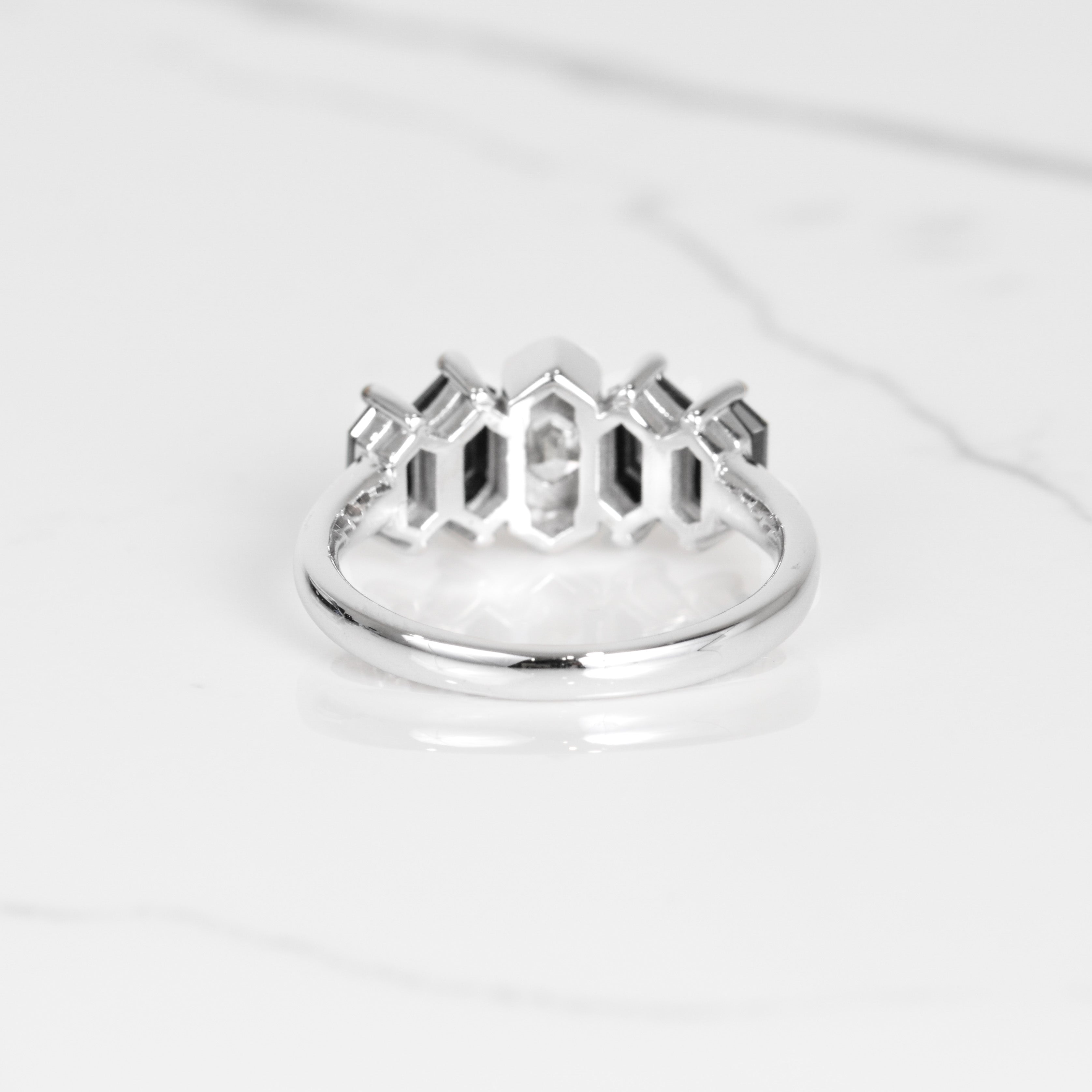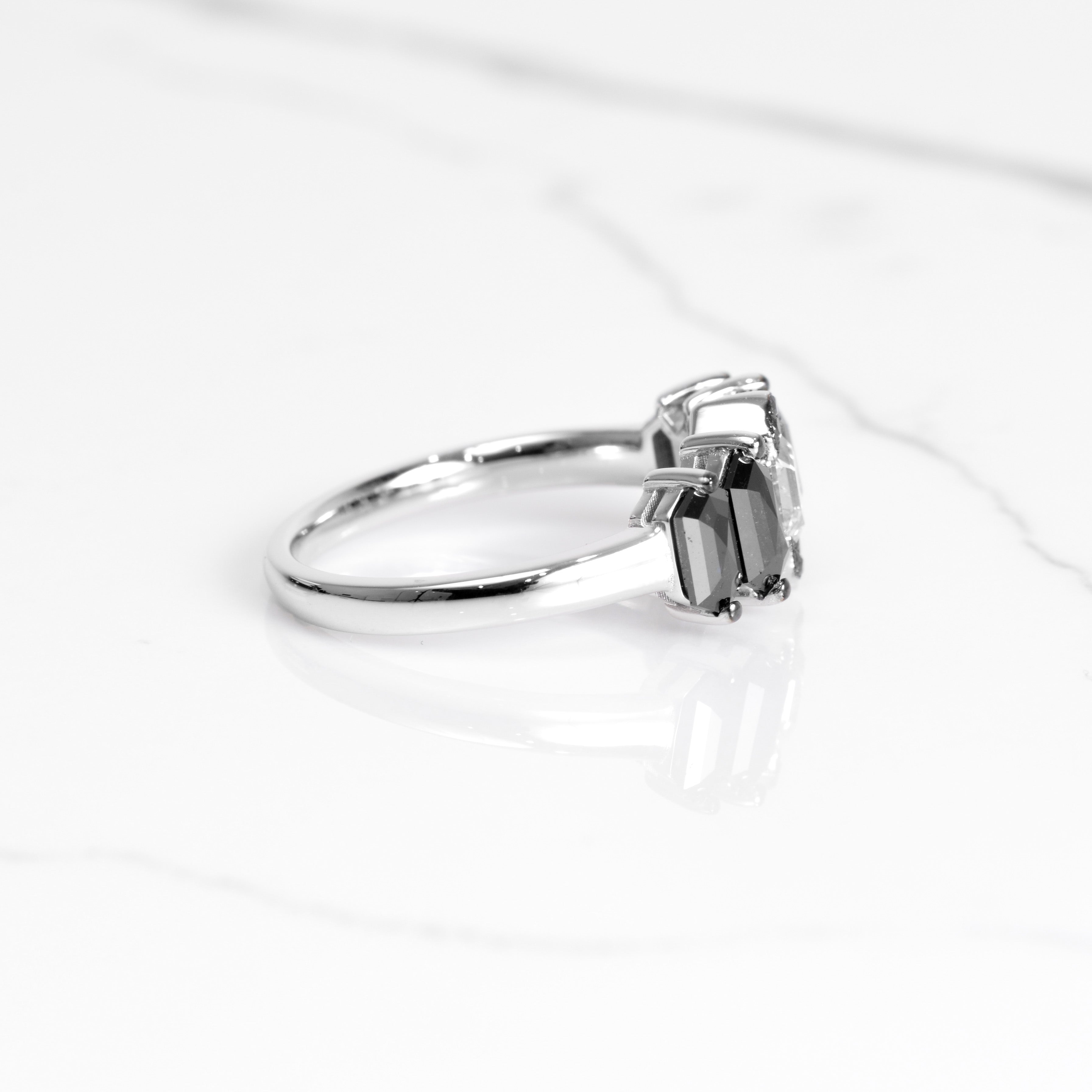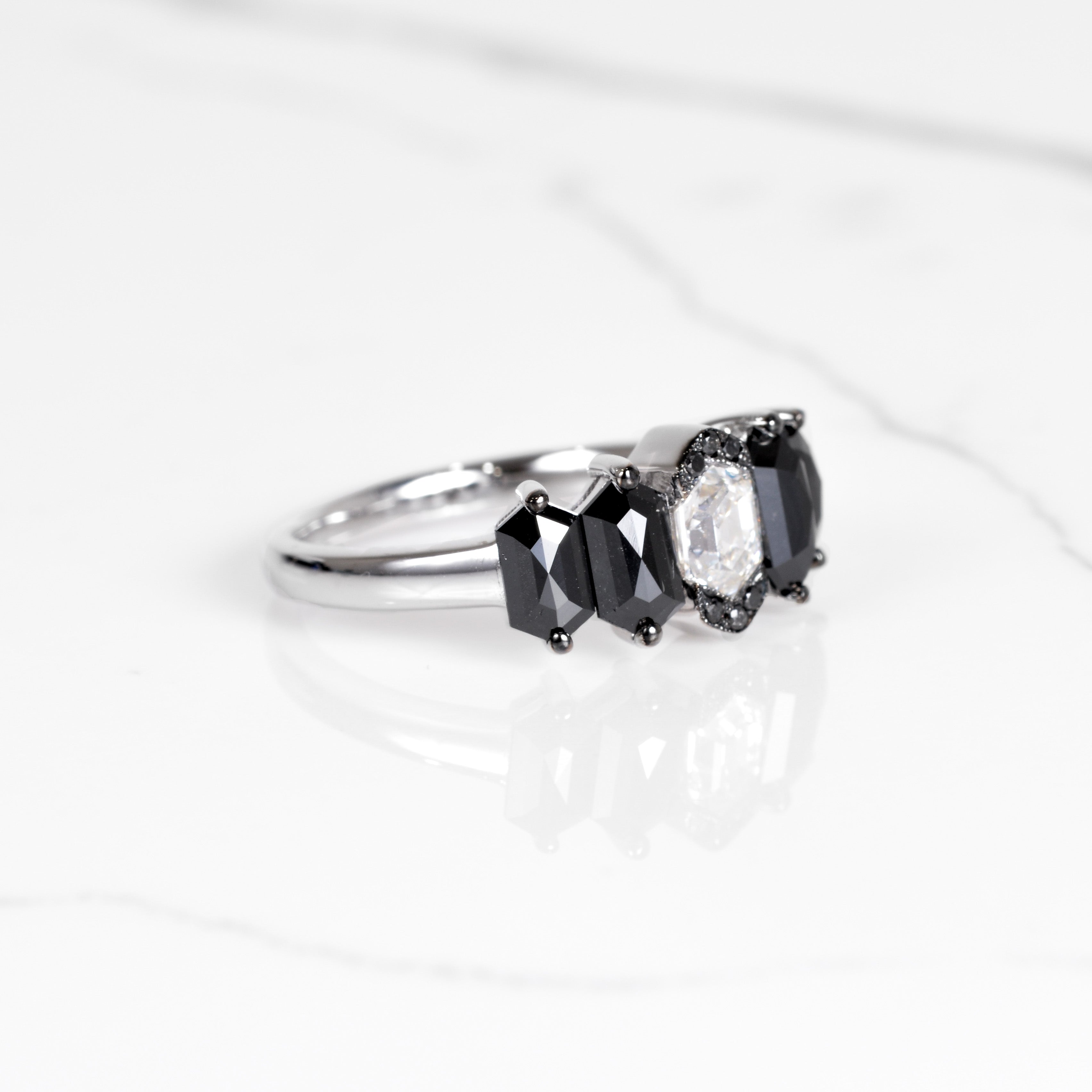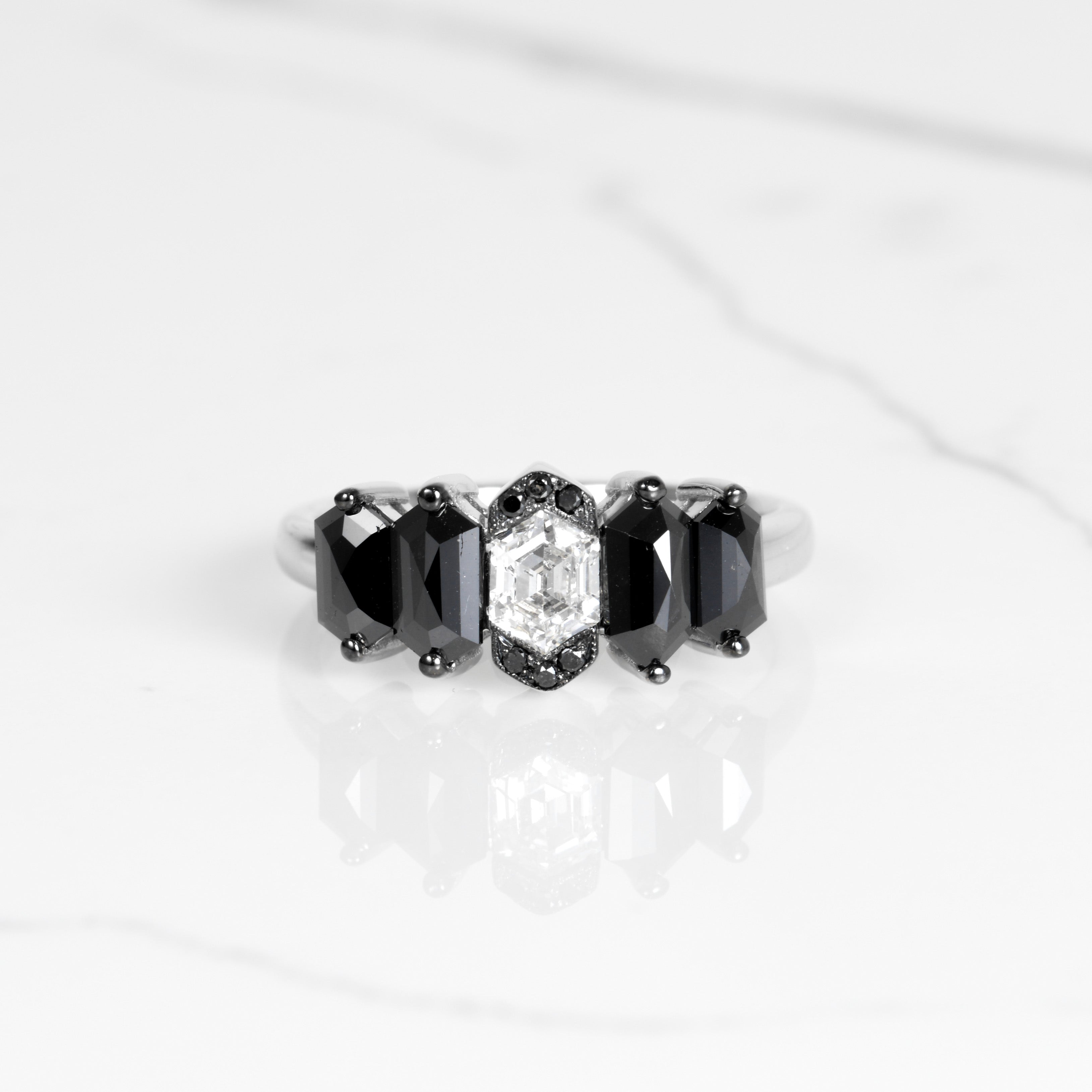 Black and white diamonds sure do go great together! The diamonds in this ring are hexagon cut diamonds which make for a unique and stunning look. The elongated hexagon cut black diamonds total 2 carats and surround a beautiful hexagon cut white diamond that is .50 carats. Accenting the beautiful white hexagon diamond are small black diamonds. All tastefully set in 14k white gold. Ring size is a 7.