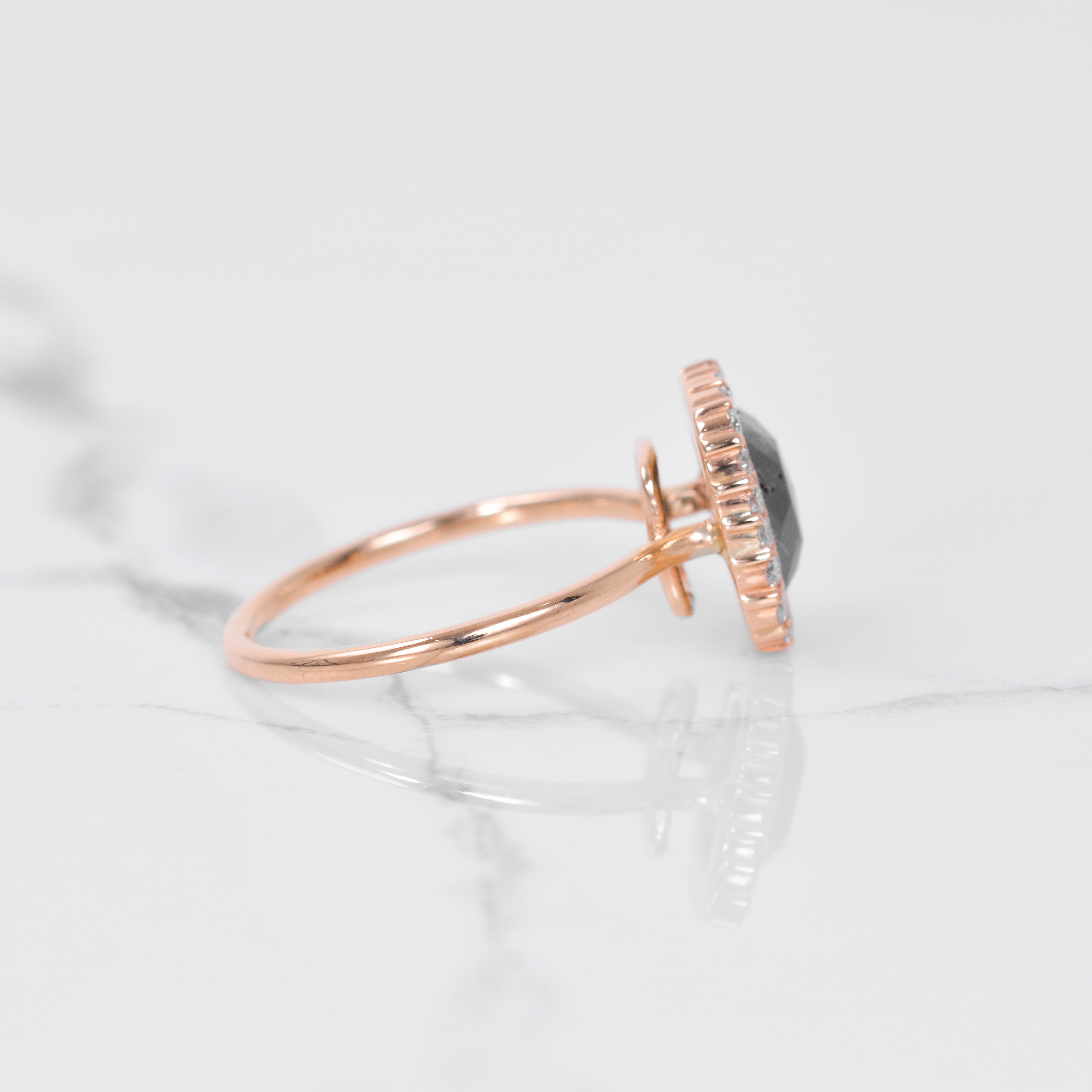 A beautiful 1.86 carat cushion cut black diamond set in a unique scalloped diamond halo. The halo is made up of sparkling white diamonds, all set in 14k yellow gold. Making for such a classy and elegant ring! Size: 7 Weight: 6.5 grams