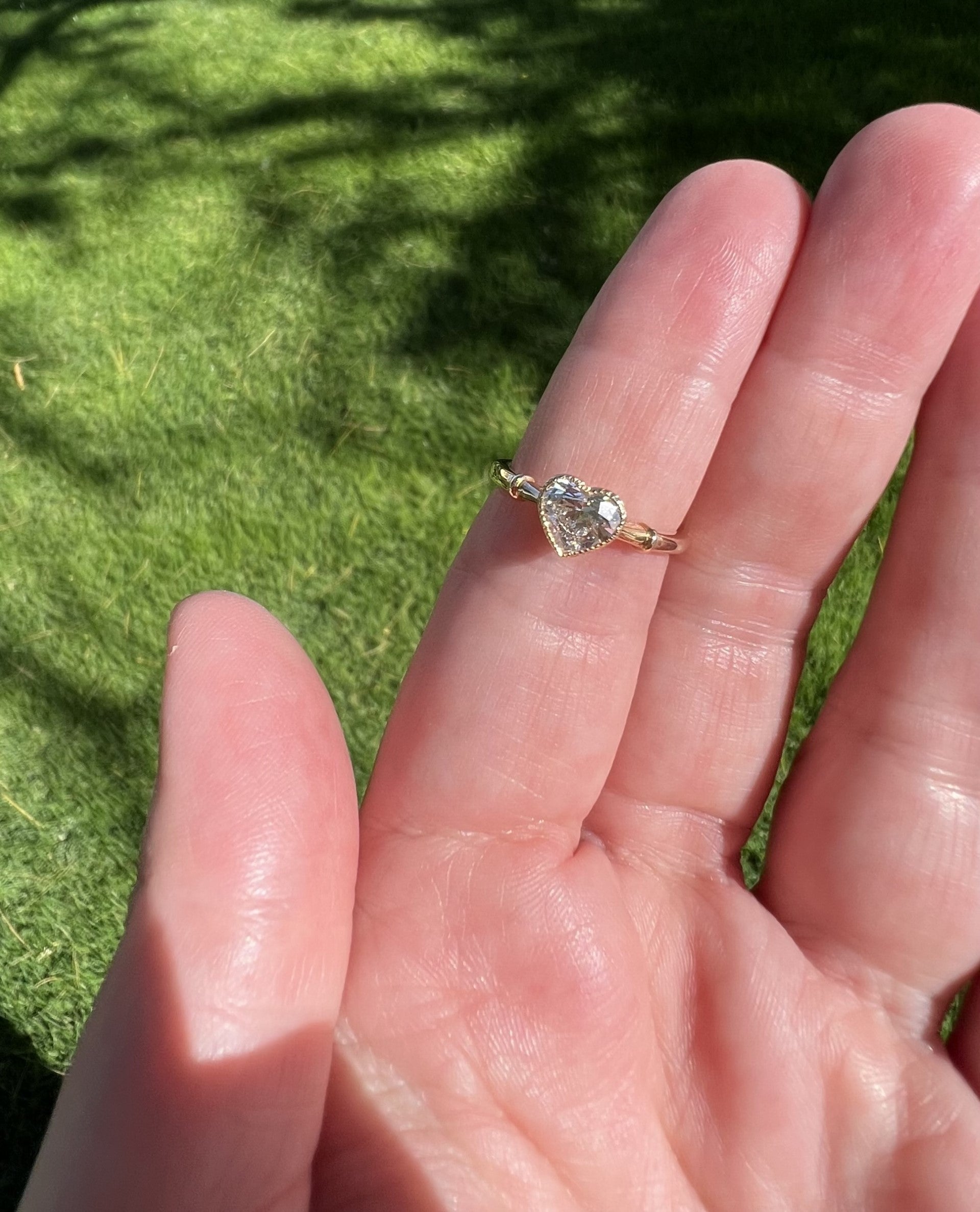 Can't go wrong with a solitaire diamond ring! This diamond solitaire ring has a .93 carat GIA certified diamond heart center that is I in color with Si1 clarity. Set in 14k yellow gold. Ring size is a 7.