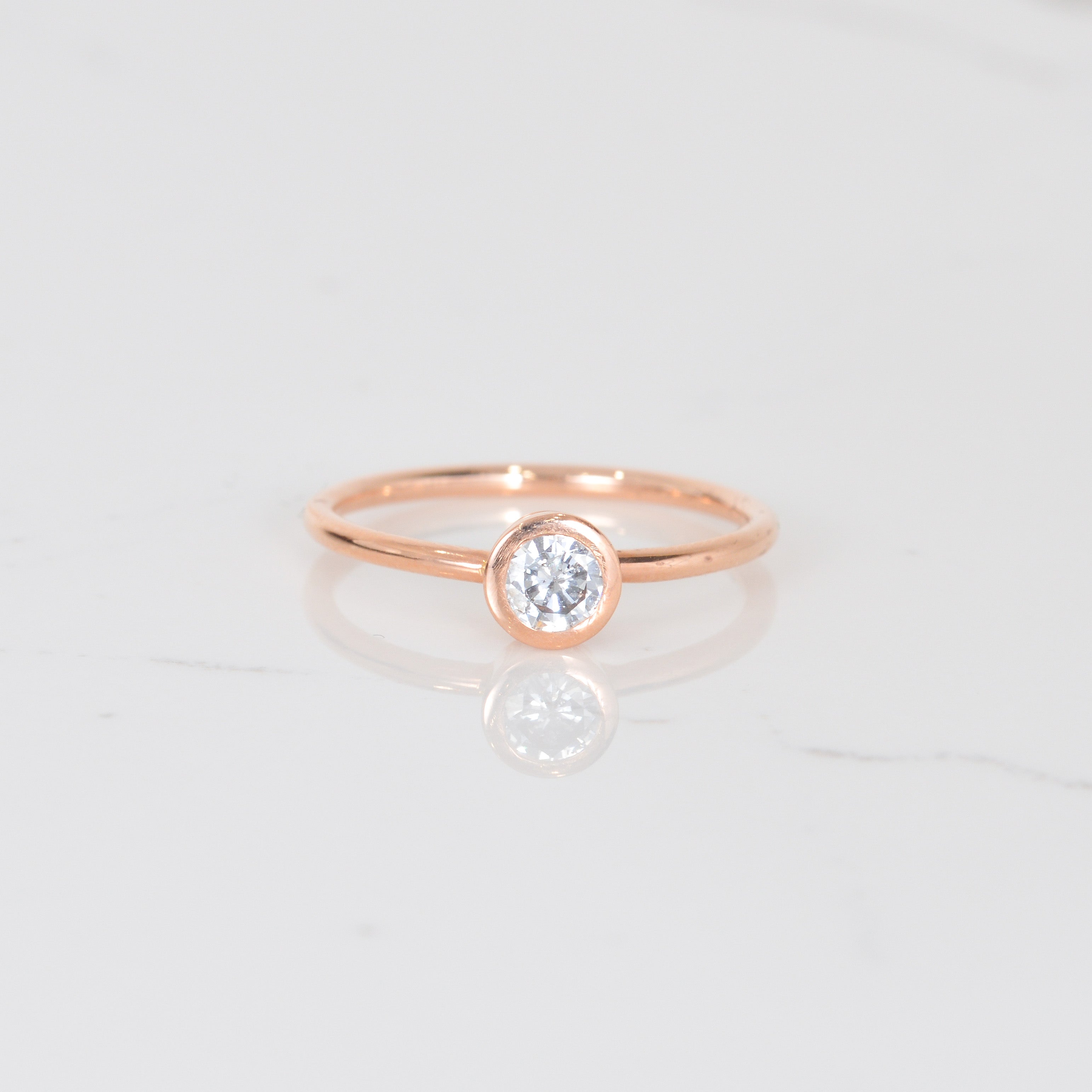 From our LXV Della Bezel collection, this round diamond ring is classy and elegant! The .27 carat diamond is placed in a simple bezel setting, all set in beautiful 14k rose gold. Wear this gorgeous ring on its own or with other bands!