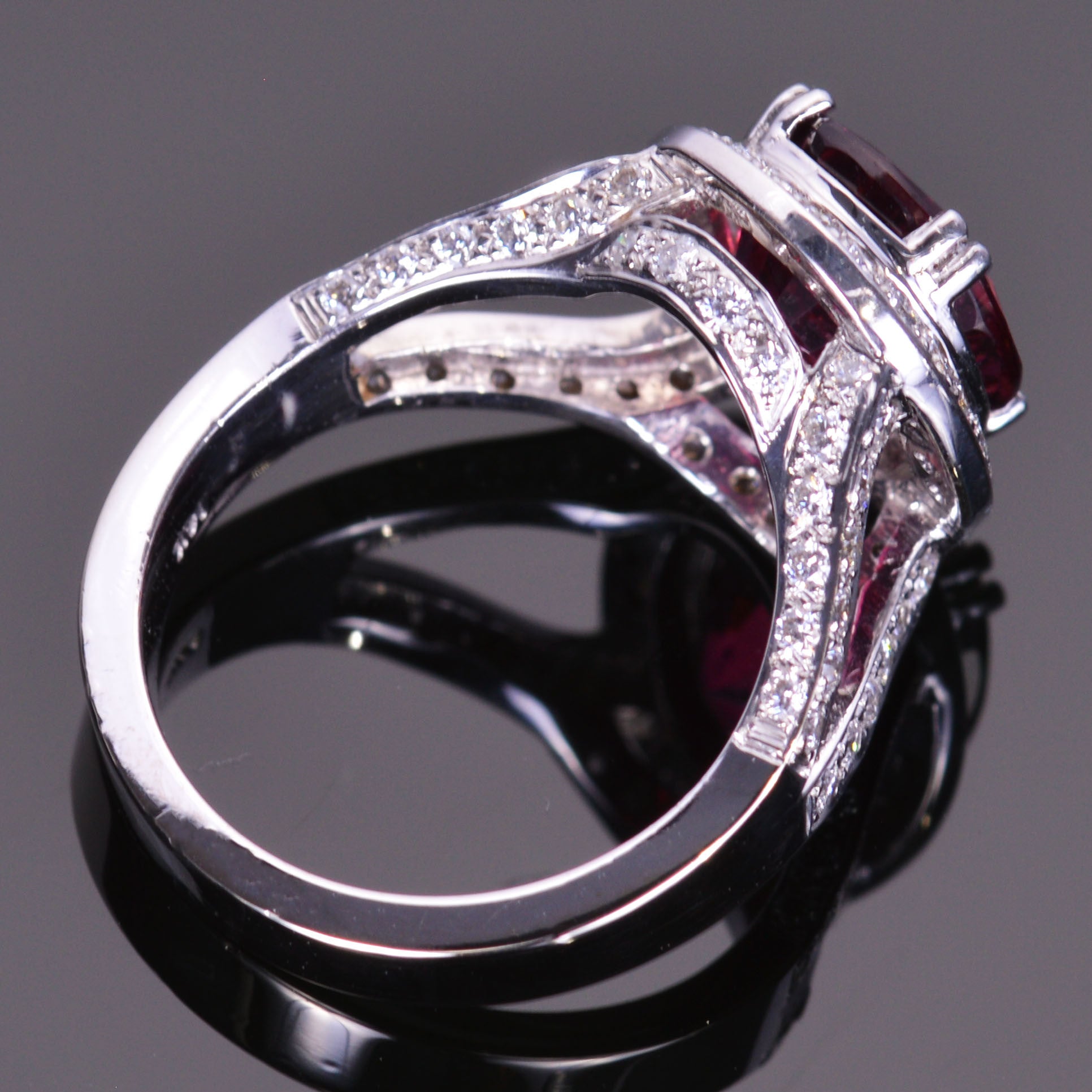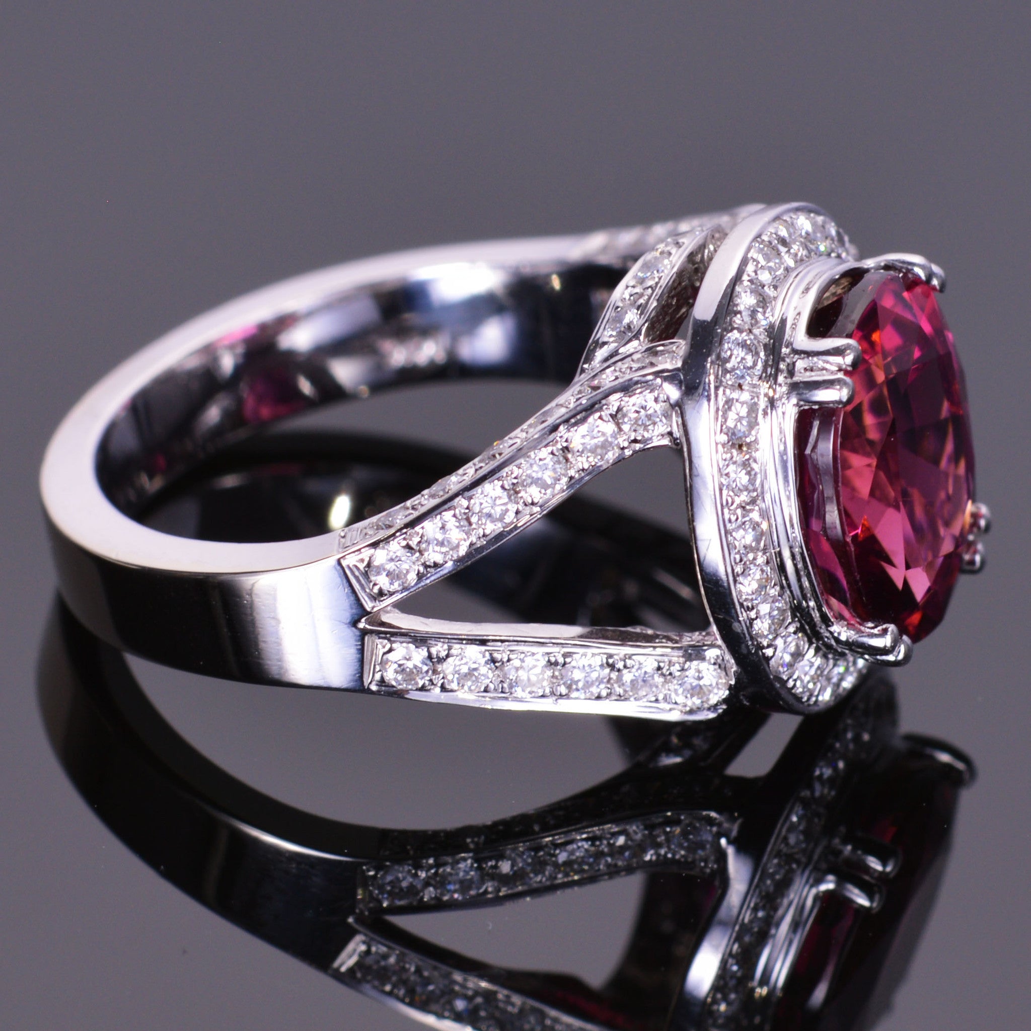 This 4.72 carat pink tourmaline is incredibly rich in deep pink color. The very stylish halo setting is made is 14k white gold and is accented by 1.02 carats of brilliant white diamonds.