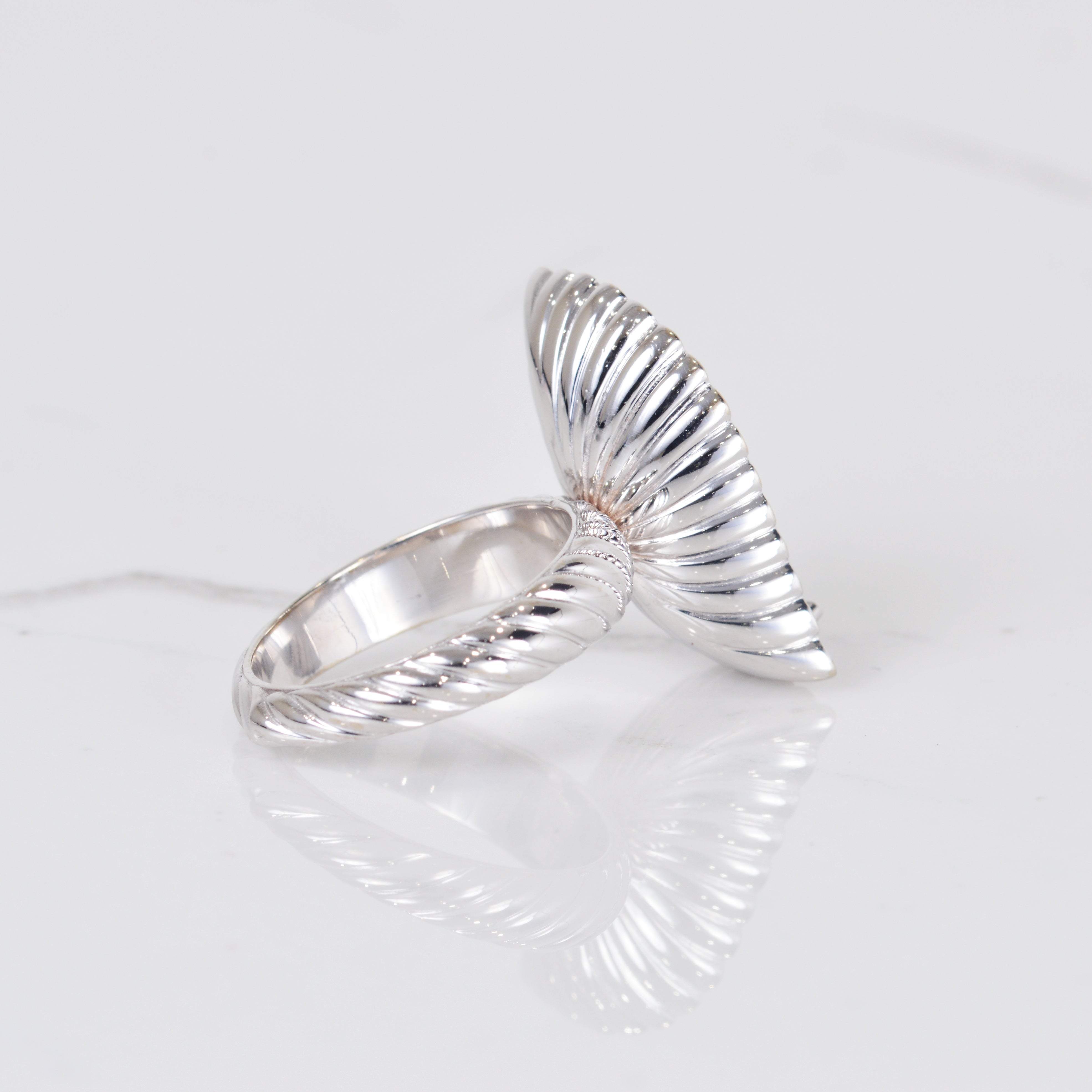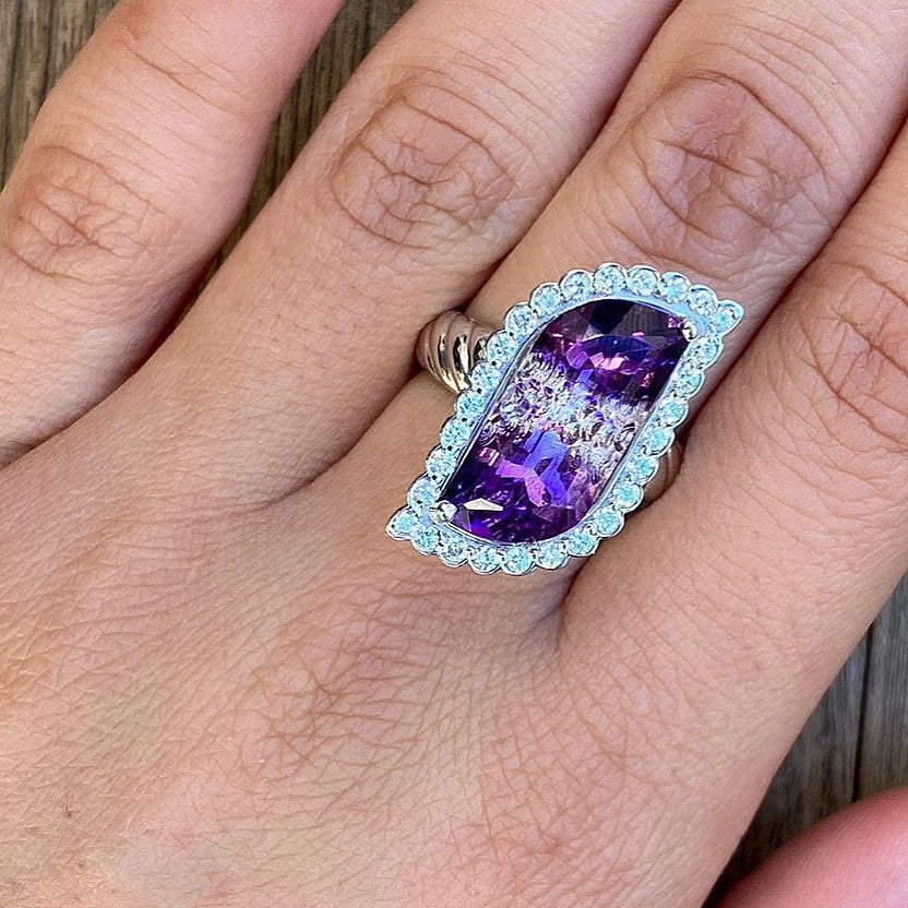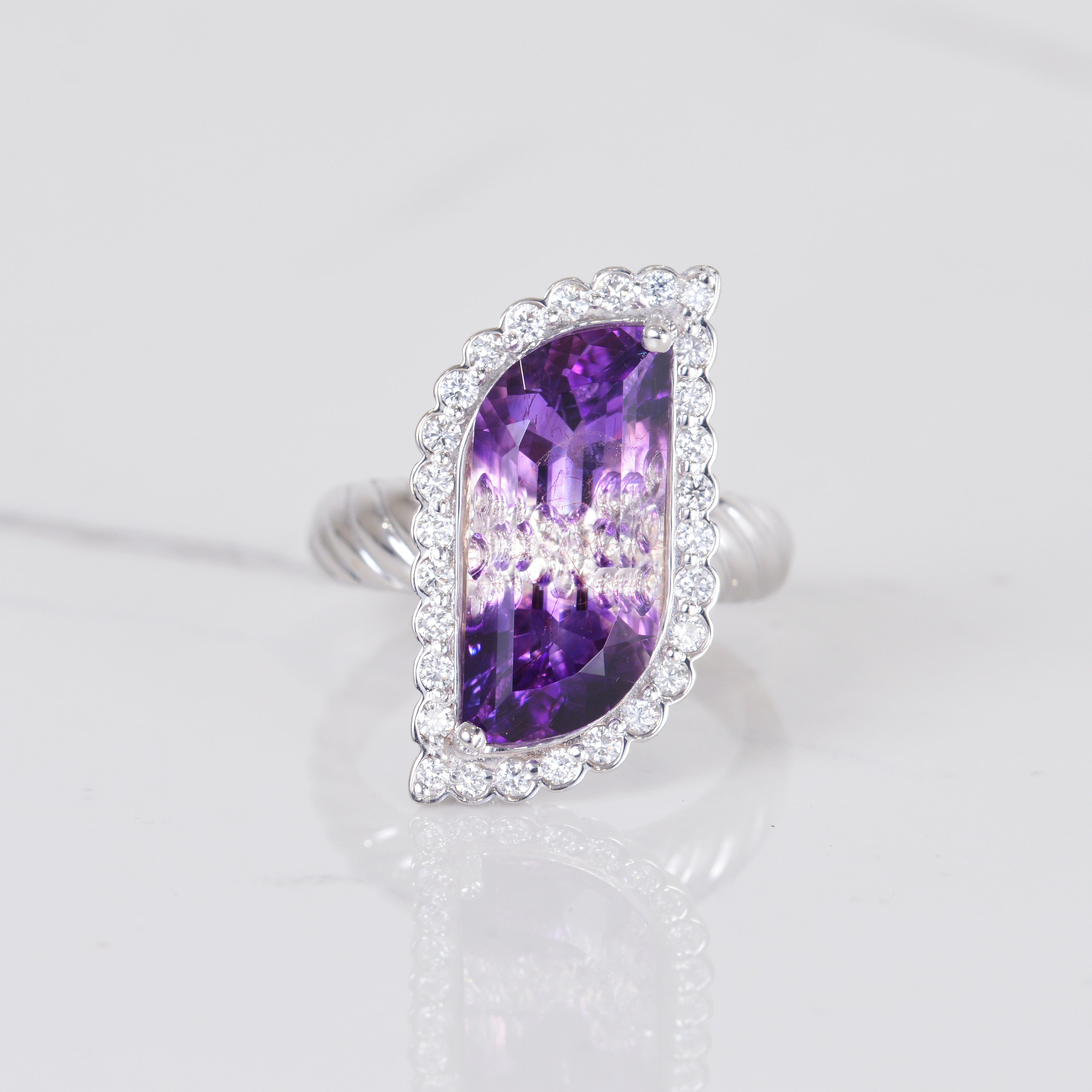 This ring is truly magnificent! The center stone is a unique and gorgeous 5.58 carat bi-color amethyst. Accenting this one of a kind stone is .44 carats of beautiful diamonds. All set in 14k white gold. Ring size is a 7.