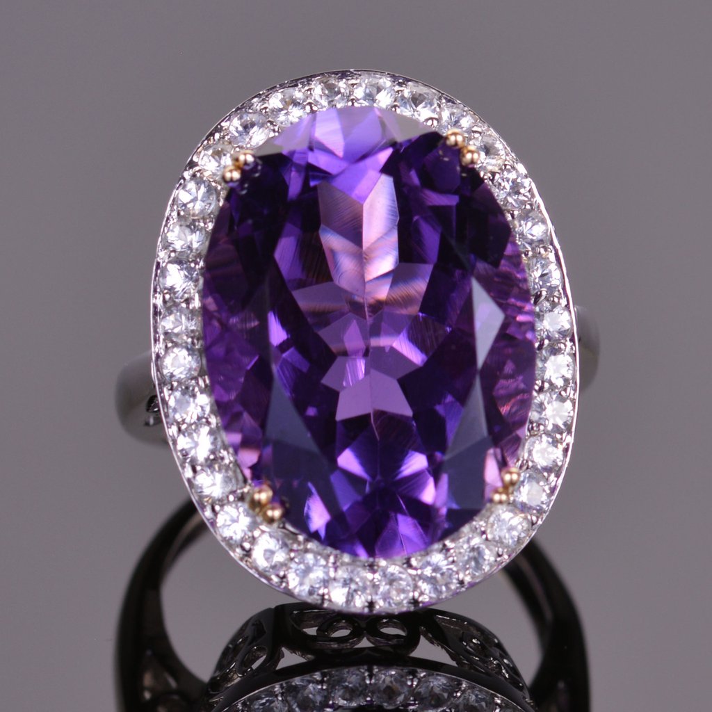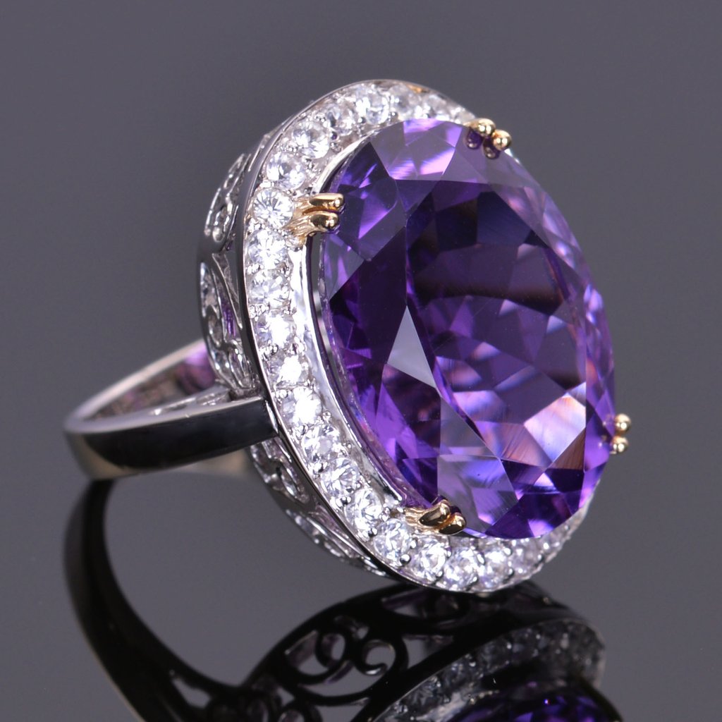 This ring's electric amethyst center stone is a massive 16.25 carats surrounded by .71 carats of dazzling diamond cut white sapphires. Beautifully cast in solid 14K white gold. The dimensions of this ring are 21.8mm x 17.2mm. Ring size is a 4.5.