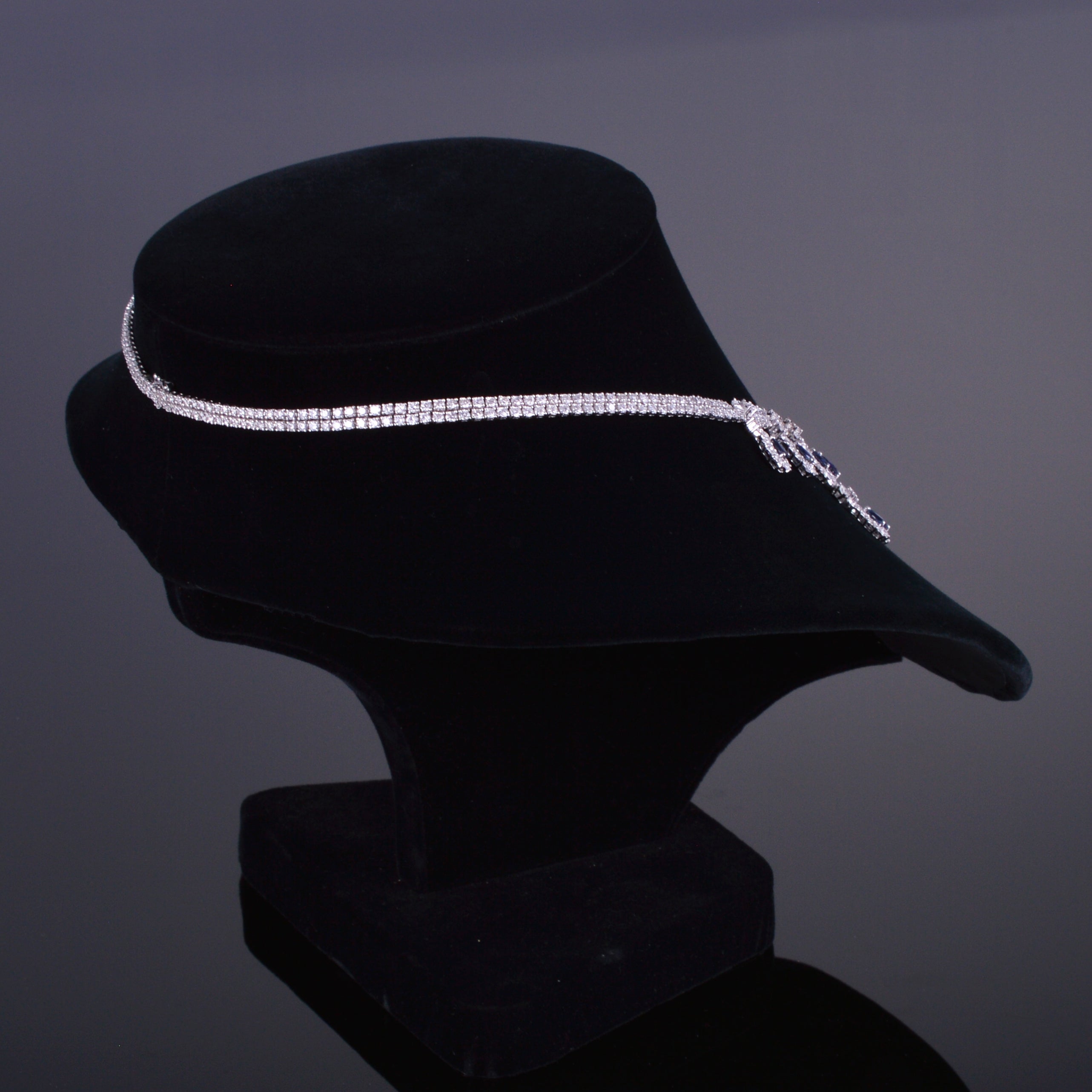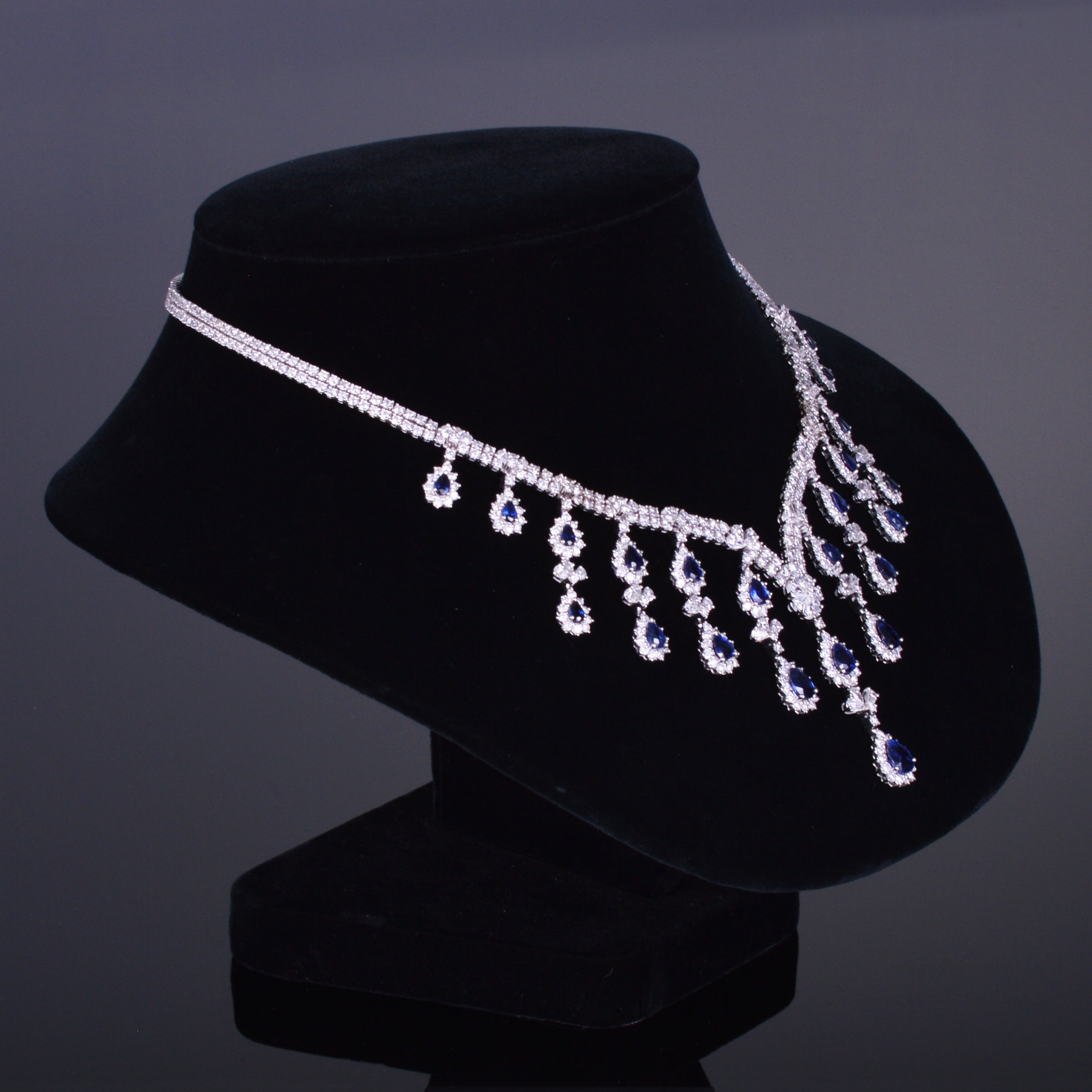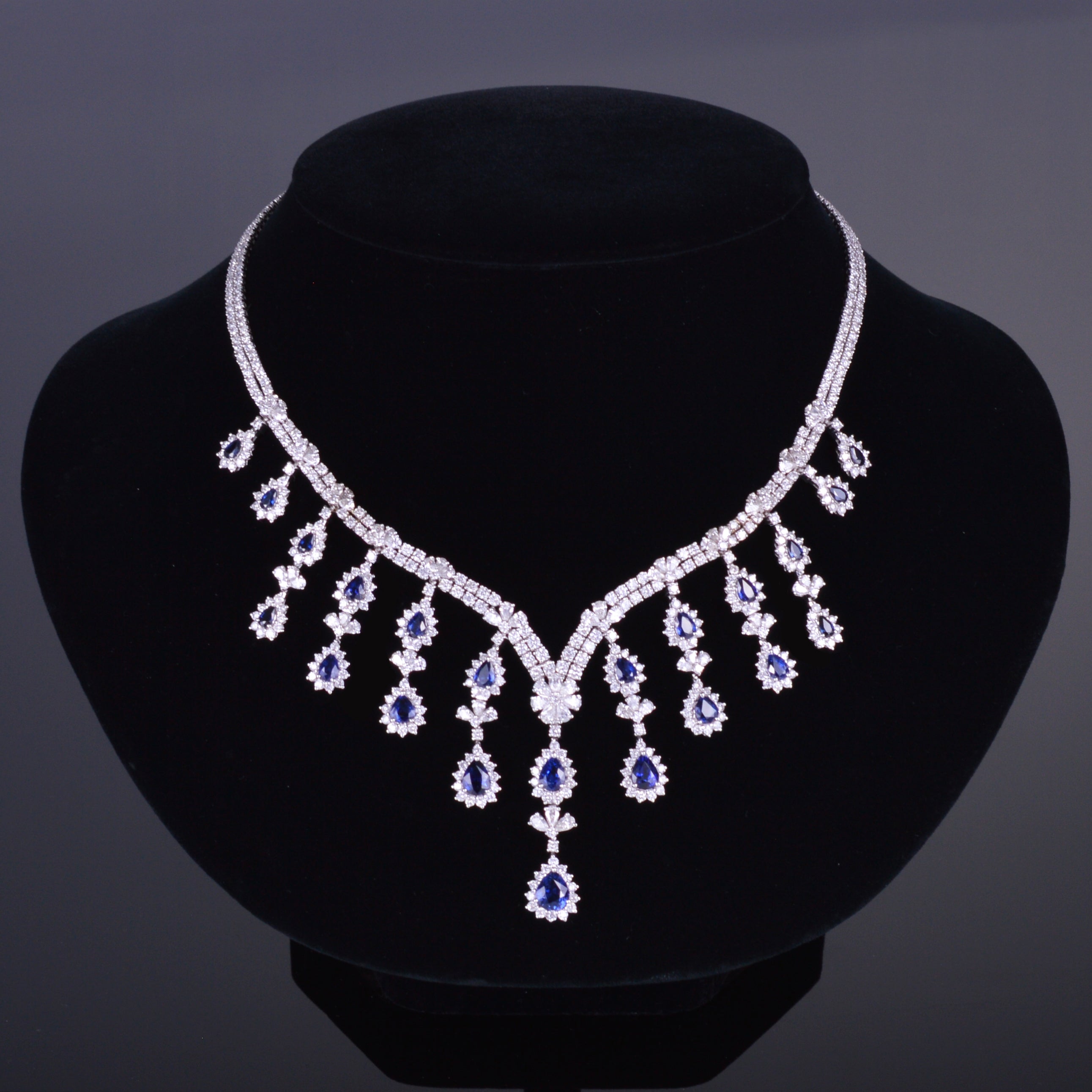 This gorgeous necklace screams royalty! With 23.72 carats of beautiful white diamonds and 13.60 deep blue sapphires all set in 18k white gold. You are bound to feel the queen while wearing this necklace on any red carpet!