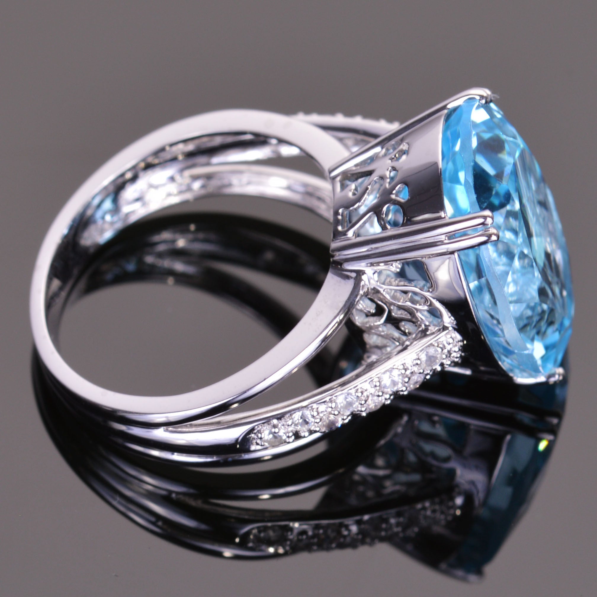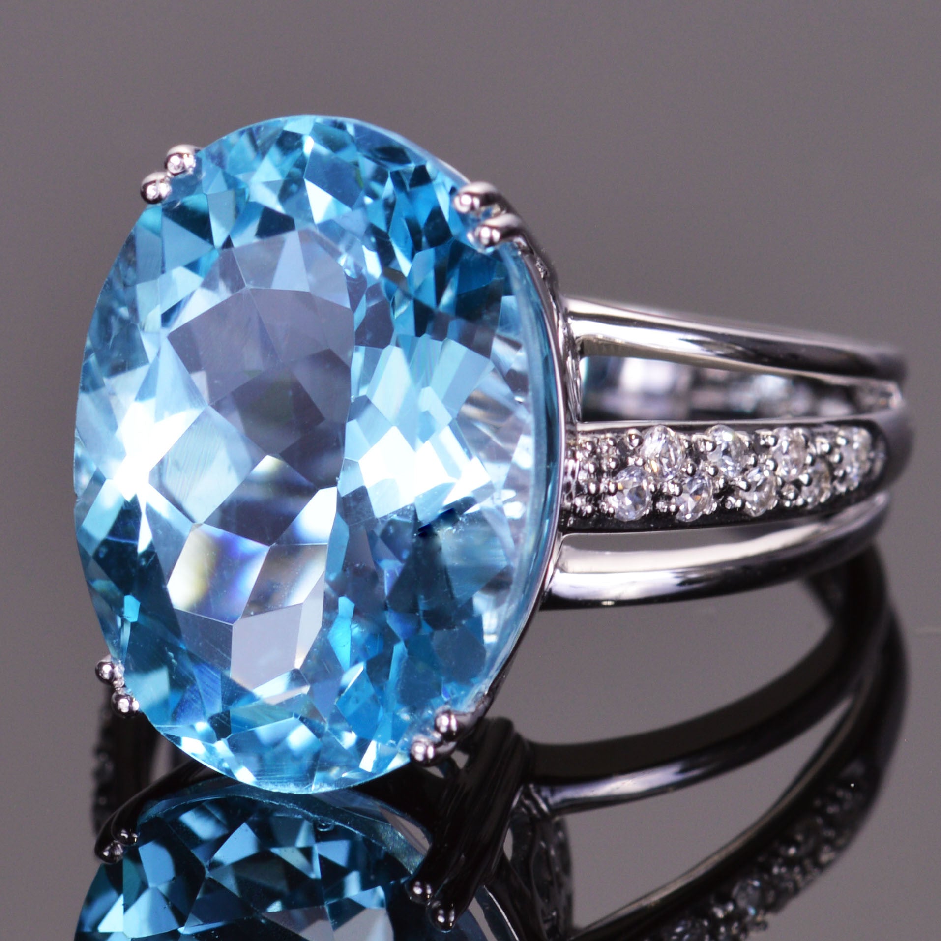 This ring's electric Blue Topaz center stone is a large 16.62 carat oval cut. Over .26 carats of dazzling White Sapphires cascade down each band of the ring creating an elegant eye catcher. Beautifully cast in solid 14K white gold.