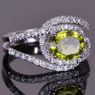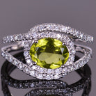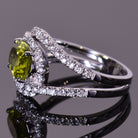 Our masterfully handcrafted Infinity ring consists of .38 carats of sparkling Diamonds intricately surrounding the vibrant colored 1.90 carat Peridot gemstone. This setting portrays the magnificent illusion of an endless stream of diamonds.
