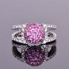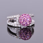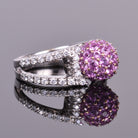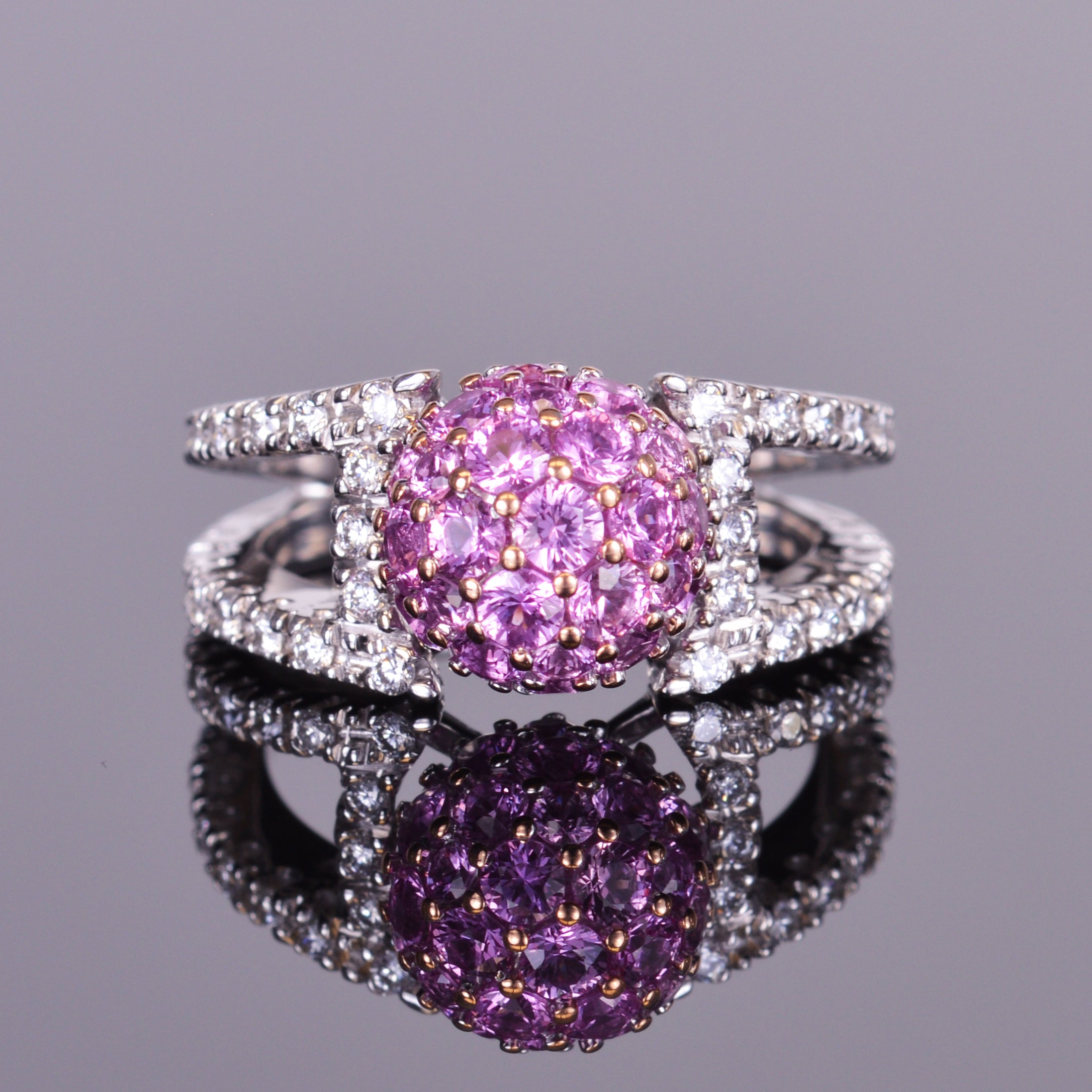 This contemporary ring elegantly combines 3.90 carats of pink sapphires and .58 carats of beautiful white diamonds. All set in 18k white and rose gold. Ring size is a 7 and weights 10.9 grams.