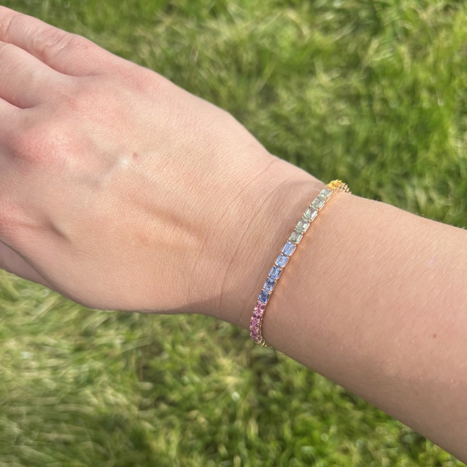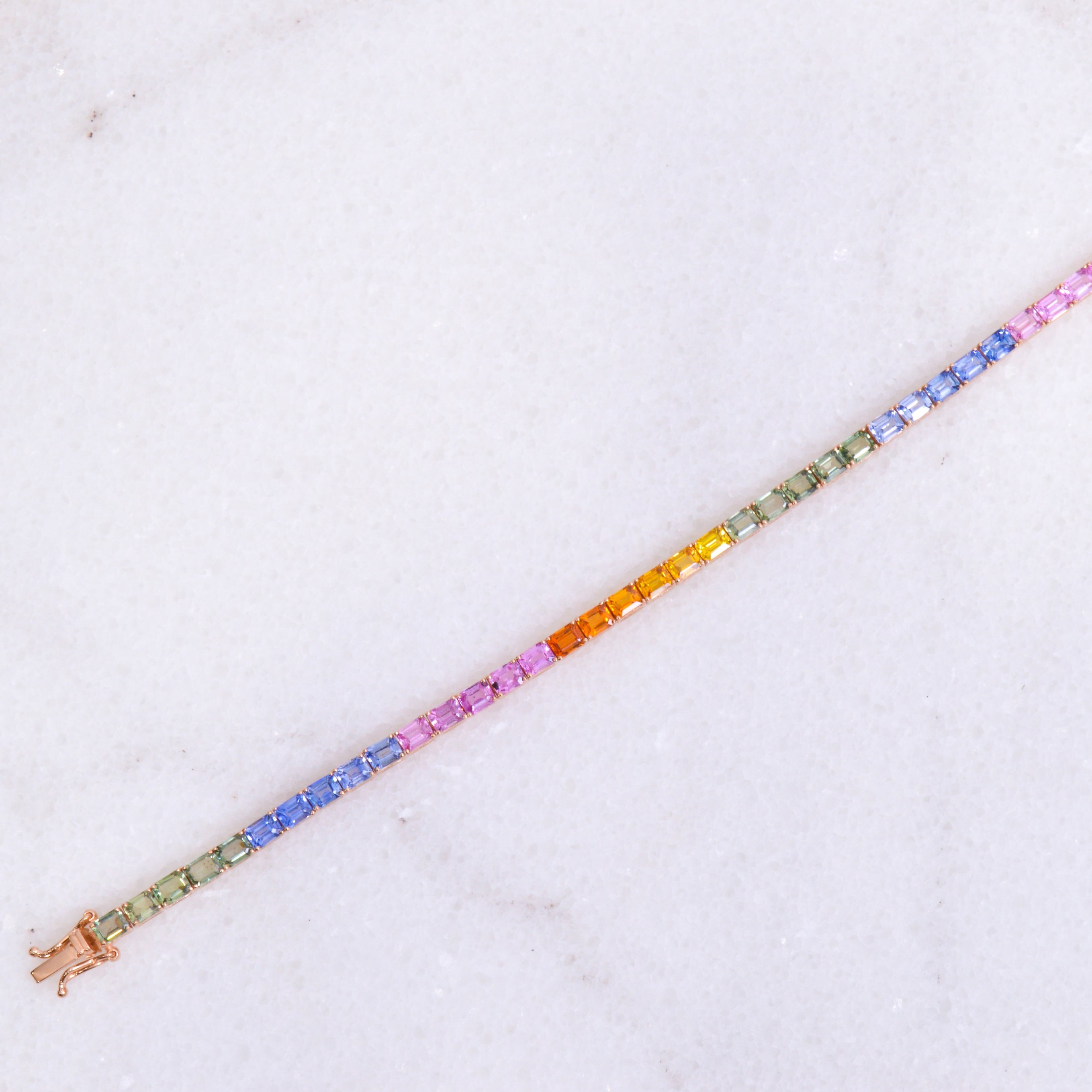 This bracelet is quite a statement piece with a beautiful pop of color! With gorgeous multicolored emerald cut sapphires totaling 11.24 carats, all hand set in 14k rose gold. This bracelet measures 7 inches in length.
