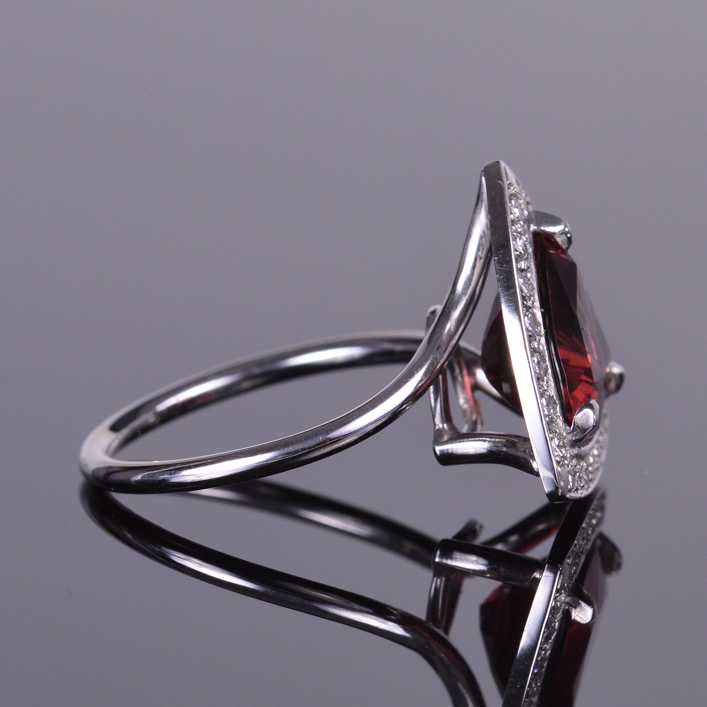 This ring is a fashion statement! The ring is 17 mm x 17mm in size, and it focuses on a natural 5 carat rubellite wrapped with .38cts of brilliant diamonds. This ring was meticulously handmade here in our salon.