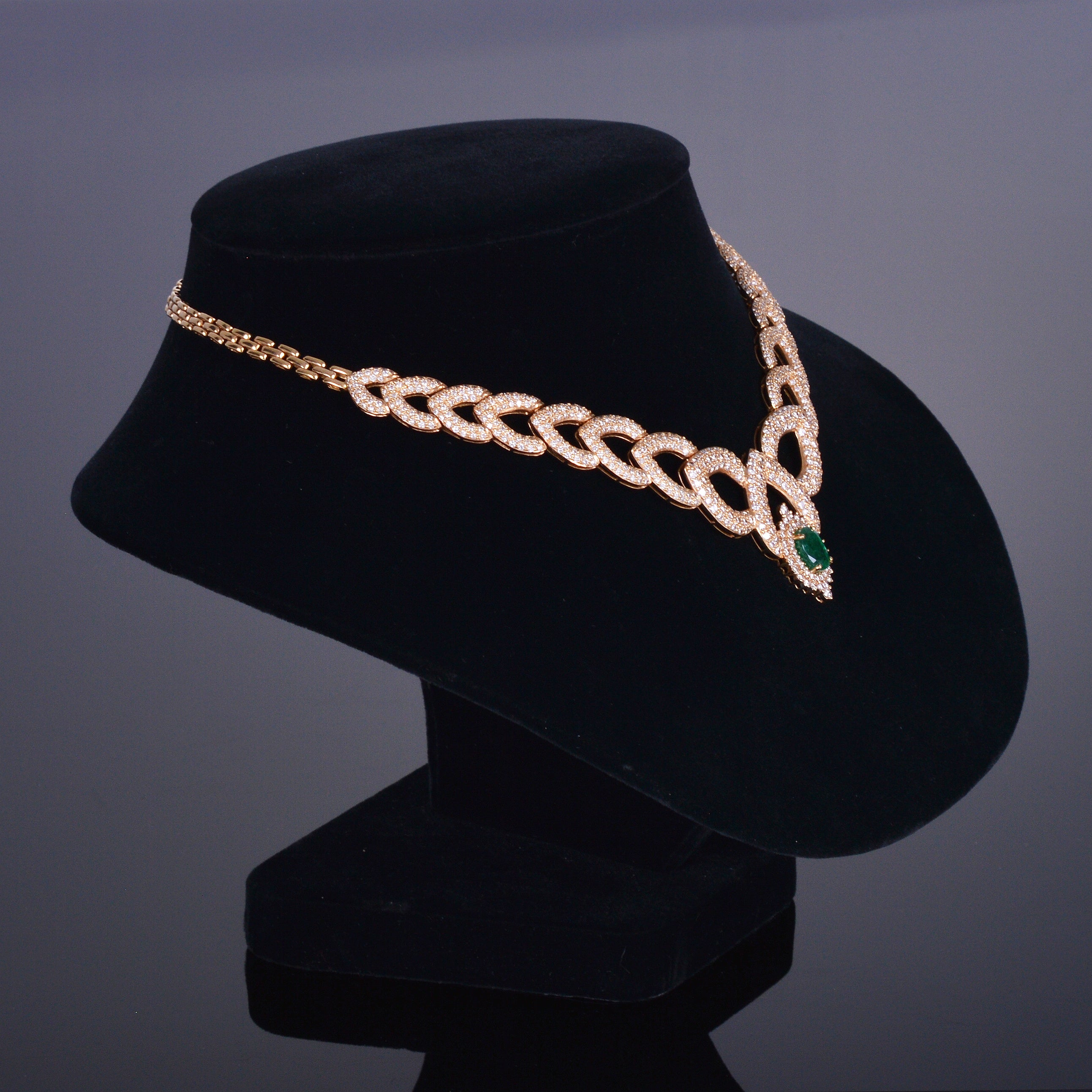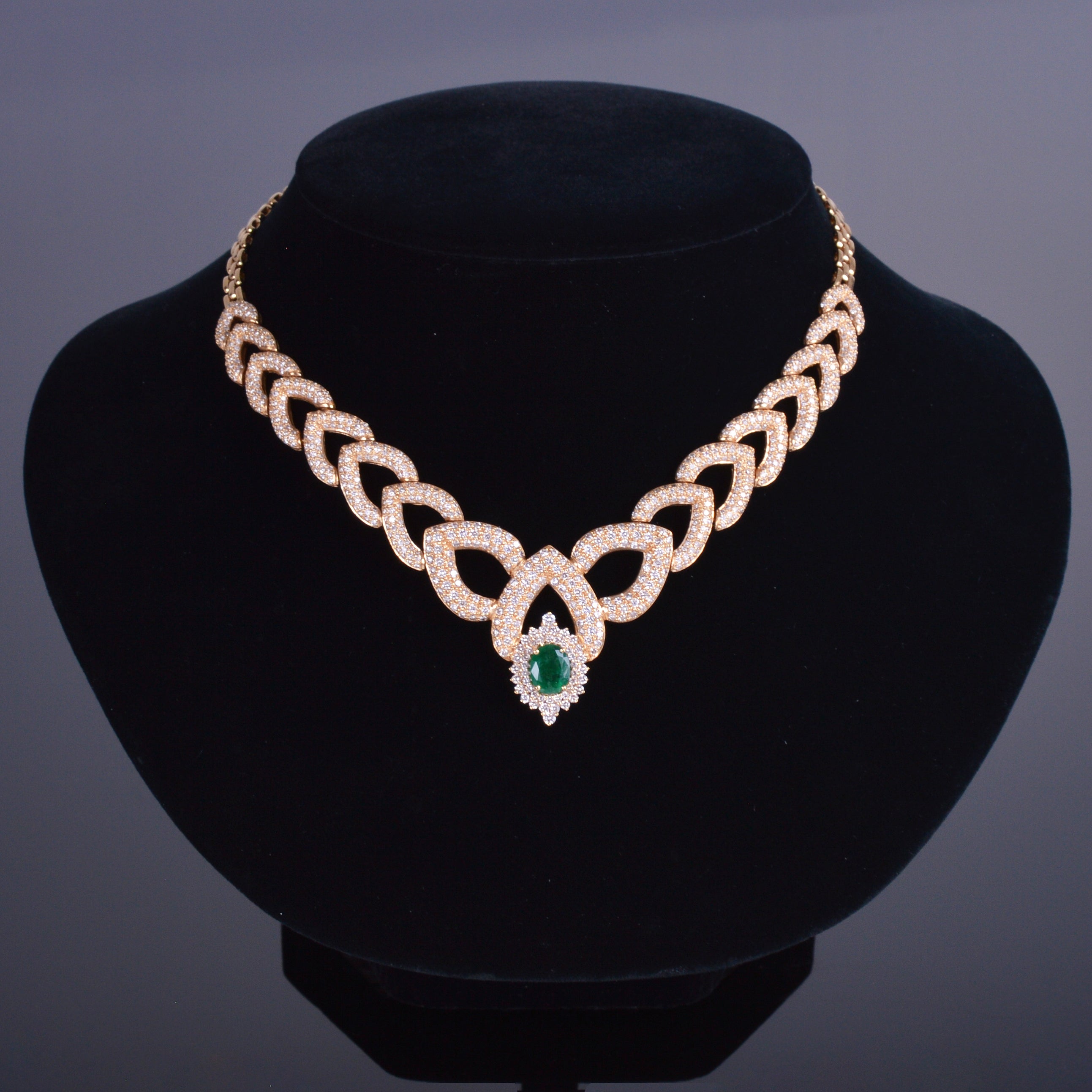 The Regal XV necklace is classic and timeless. Featuring a 3.54 carat oval shaped emerald, the 18k yellow gold necklace is encrusted with 10.86 carats of gorgeous diamonds.
